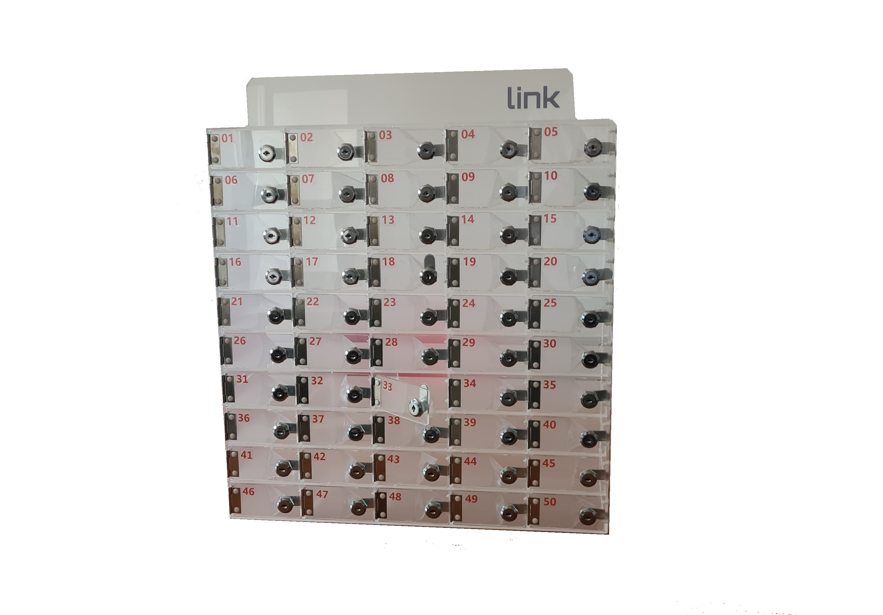 Box con 50 alloggiamenti con chiusura a chiave, di dimensioni cm 18x10x5.Ogni alloggiamento ha una chiave diversa, e ci sono tre chiavi master che aprono tutte le serrature.Ci si possono alloggiare dispositivi come smartphone, chiavi o altri oggetti.La dimensione dei vani и cm 18x5x10In plastica con spessore 3 mm.Non и una cassaforte o una cassetta di sicurezza, puт servire in ambienti comuni come uffici o classi di scuola per riporre oggetti per brevi periodi.Si puт anche appendere a muro.