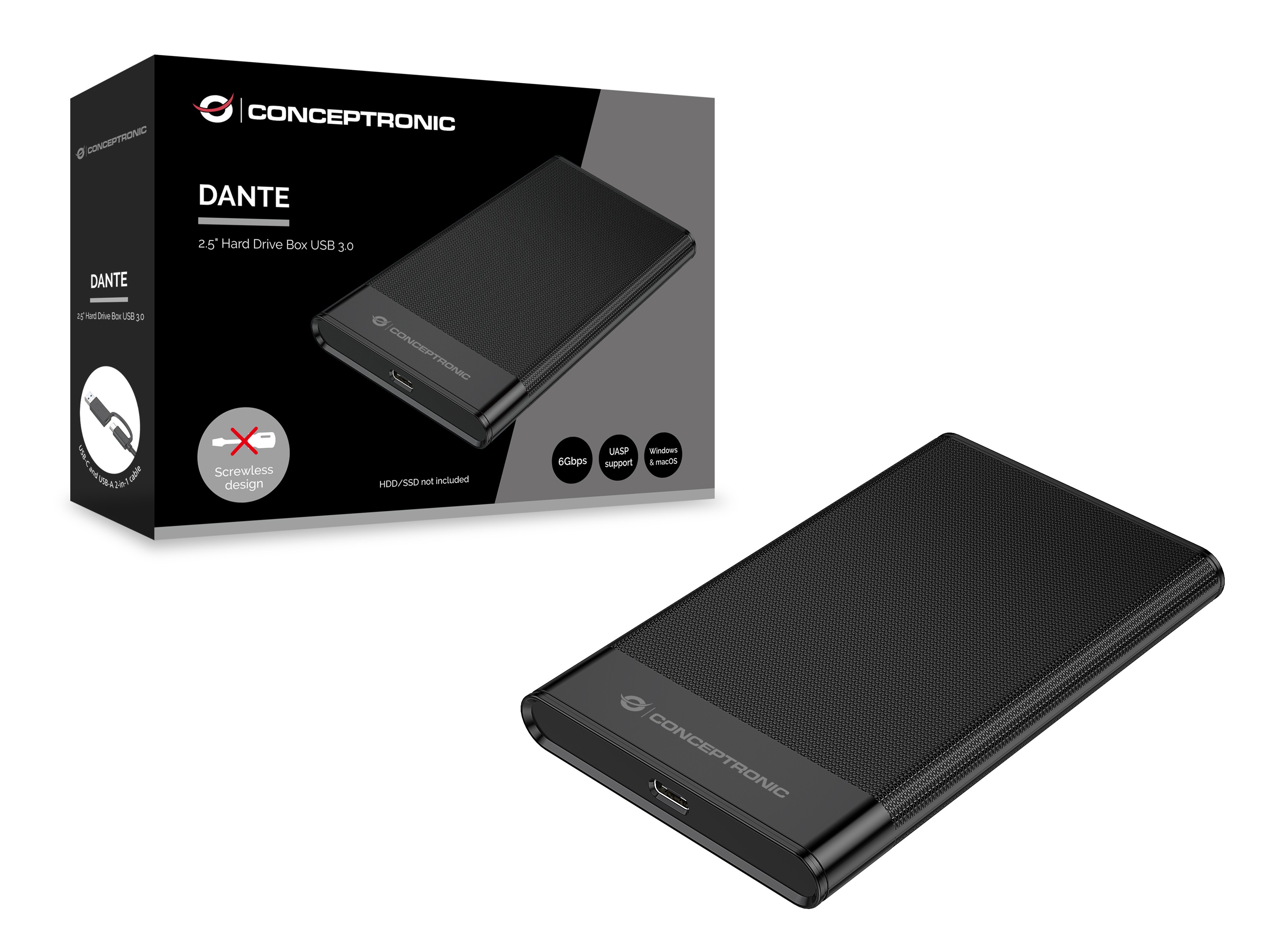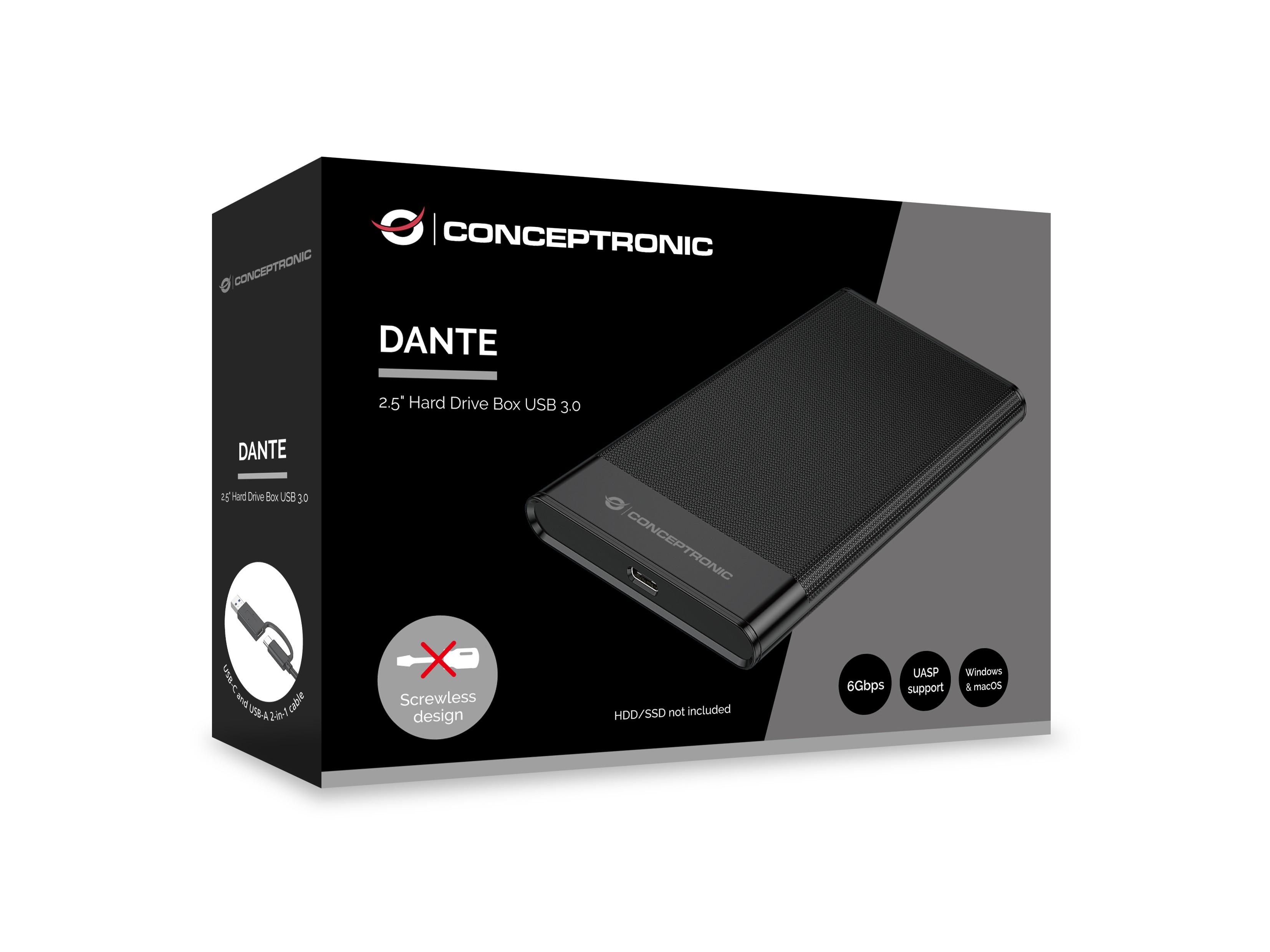 Conceptronic DANTE06B, Box esterno HDD/SSD, 2.5", Serial ATA III, 6 Gbit/s, Collegamento del dispositivo USB, Nero