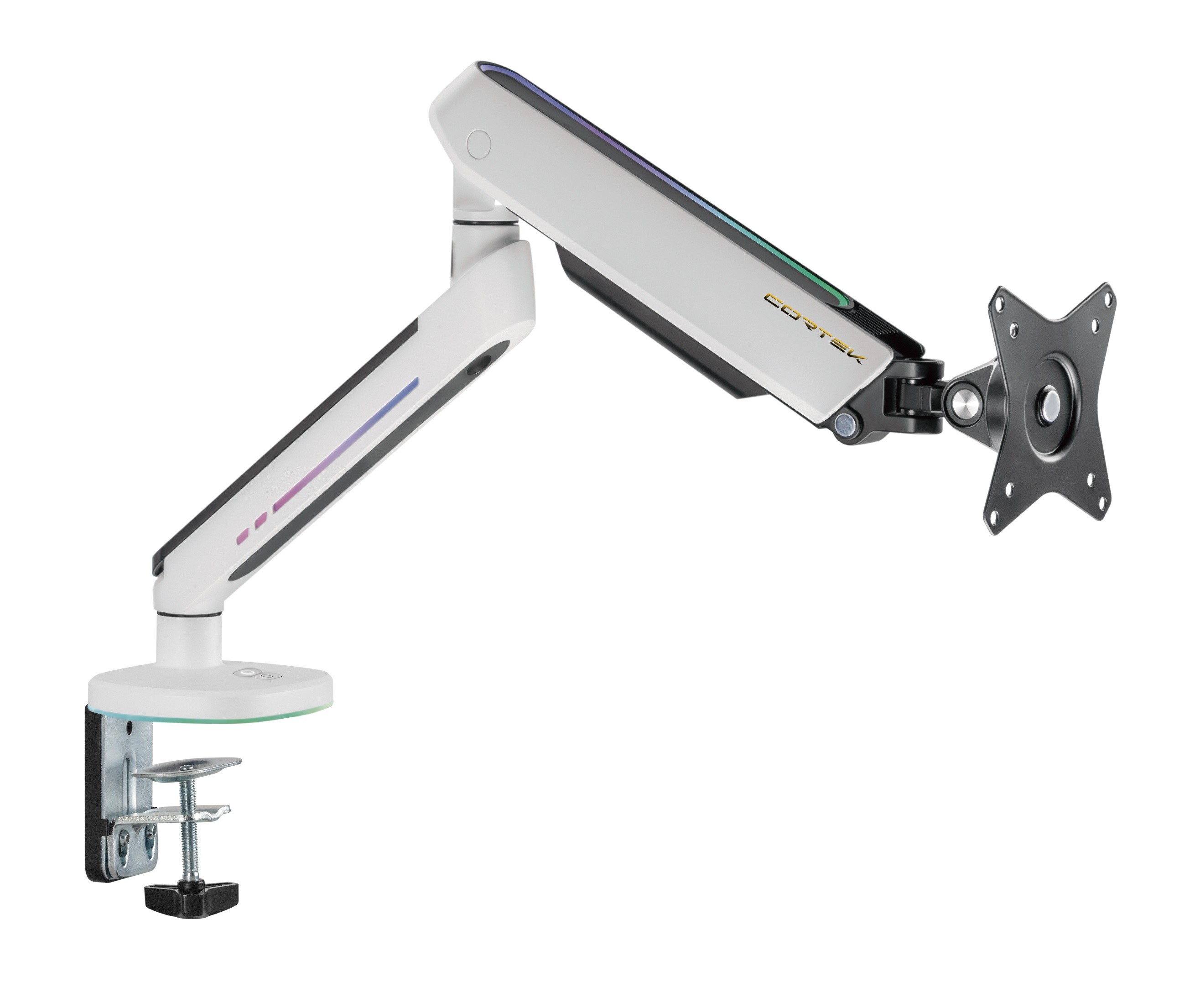 Braccio per monitor da 27'' a 45'' fino a un peso di 14 Kg.Compatibile VESA 75X75 e 100X100.Con gestione cavi.Installazione sul tavolo a morsetto.Regolazione a molla.Rotazione dello schermo +180/-180°Regolazione orizzontale +90-90°Regolazione verticale +40-40°Con luci RGB alimentate da USB