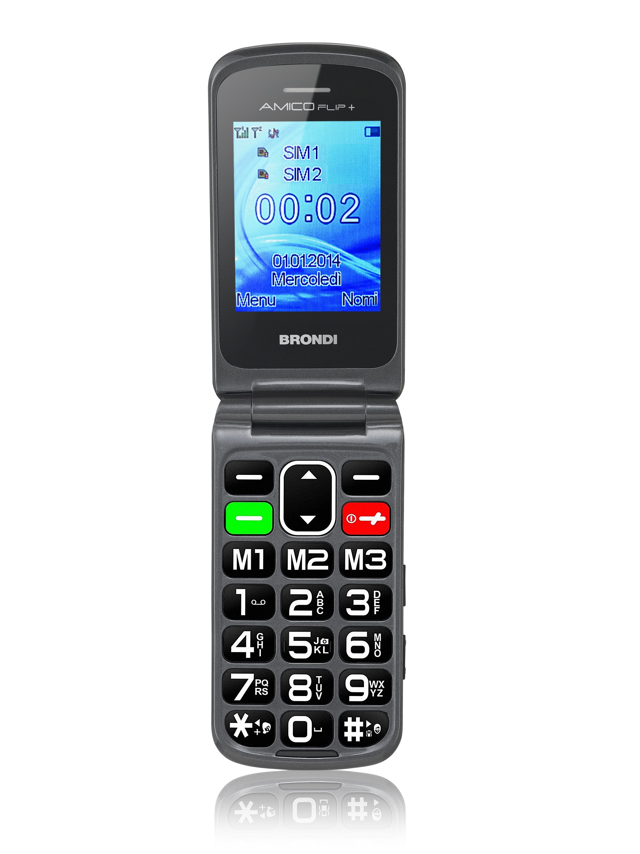 Brondi AMICO FLIP PLUS. Fattore di forma: A conchiglia. Capacità della scheda SIM: Doppia SIM. Dimensioni schermo: 6,1 cm (2.4"). Risoluzione fotocamera posteriore (numerico): 1,3 MP. Bluetooth. Radio FM. Tecnologia batteria: Ioni di Litio, Capacità della batteria: 800 mAh, Autonomia in standby (2G): 240 h. Peso: 82 g. Colore del prodotto: Nero