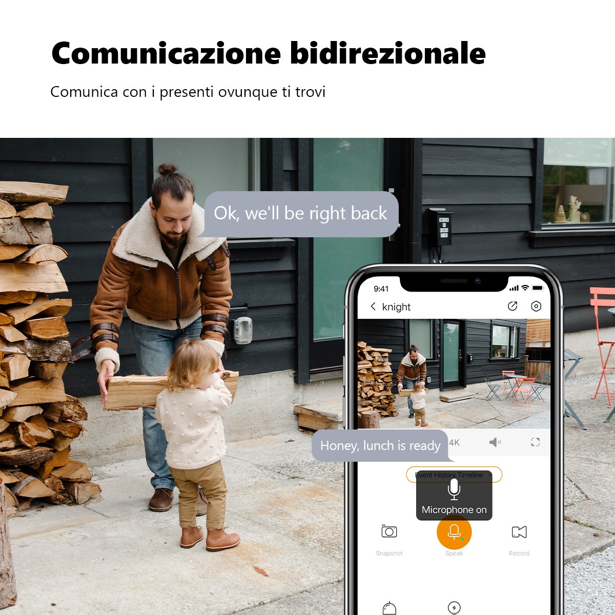 Con questa telecamera di sicurezza, nessun dettaglio sfugge al suo obiettivo. Inoltre, questa telecamera per esterni è dotata di rilevamento AI avanzato+E1, identifica con precisione le persone, ma anche i veicoli e gli animali domestici. Con Knight 4K è possibile impostare una zona di rilevamento e una linea di rilevamento. Se qualcosa o qualcuno entra in questa zona o supera la linea, immediatamente viene inviata una notifica. E' dotata di visione notturna a colori intelligente, conversazione bidirezionale e Wi-Fi 6 in dual-band a 2,4 GHz/5 GHz. Grazie alla certificazione IP66, Knight resiste a qualsiasi condizione atmosferica. Le immagini possono essere salvate localmente su SD oppure sul servizio Cloud (opzionale).