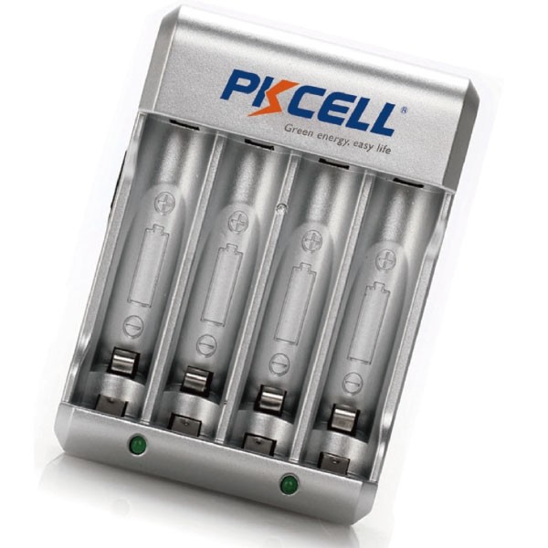 Caricabatteria per batterie stilo e ministilo ricaricabili AA/AAA, ricarica fino a 4 batterie NI-MH/Ni-Cd (ricarica a coppie). Con 2 led che indicano lo stato di carica della batteria. La corrente di carica costante aumenta la vita delle batterie. Input 100-240 vac, si può usare anche in USA. Output 2,4Vdc 300mA Carica Stilo AA 150 mA. Carica ministilo AAA 100 mA.