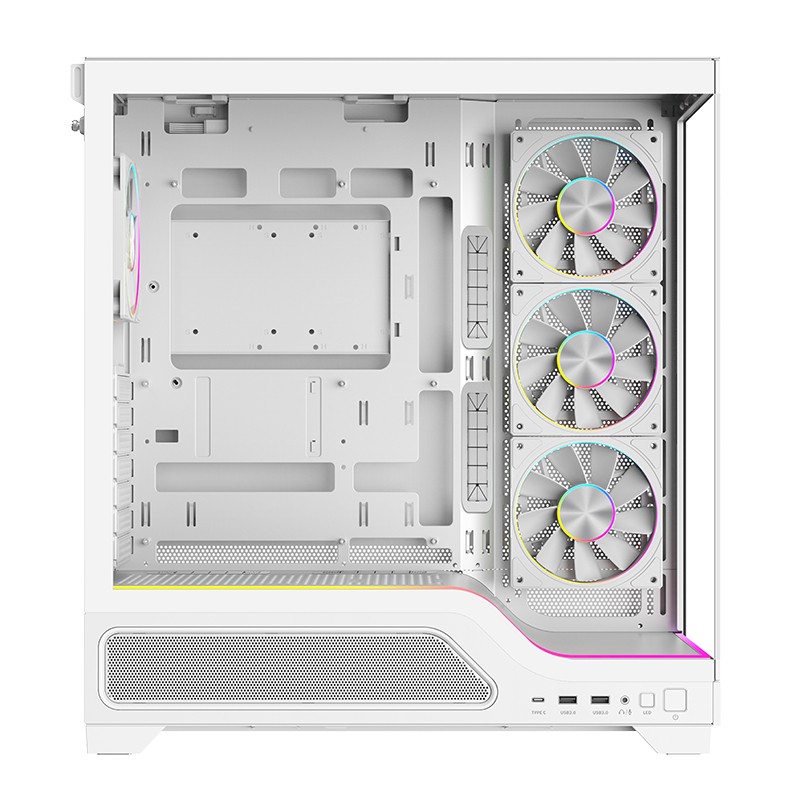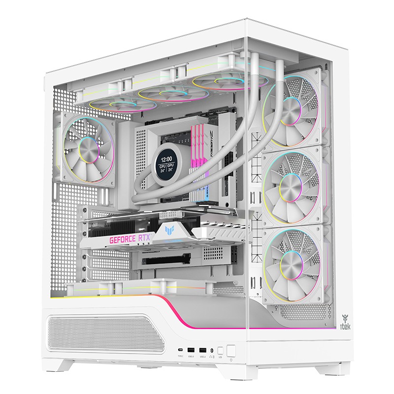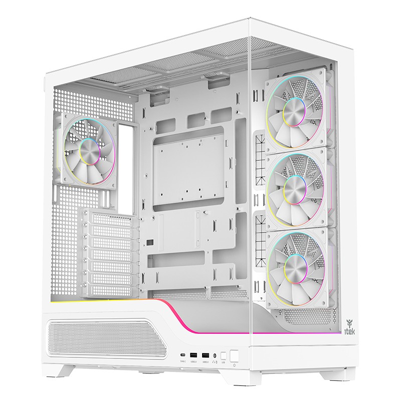 Itek SHOWBUI WAVE 82 si presenta con nuovo look moderno e accattivante. La paratia frontale e laterale sono in vetro temperato con apertura/chiusura ad incastro, senza viti!La struttura è solida e in grado di ospitare anche le nuove schede madri con connettori sul retro, per un effettivo visivo davvero super! Il vano che ospita l'alimentatore e i drive è parzialmente traforato e separato rispetto al resto del cabinet dove internamente lo spazio è tantissimo, infatti è possibile installare schede video di ultima generazione di lunghezza fino a 440mm, dissipatori alti 185mm, liquid cooling fino a 360mm, diverse ventole aggiuntive e il cable management è di 35mm. In dotazione sono presenti 4 ventole ARGB di ultimissima generazione per una resa estetica al top e un air flow ottimale. Tutte gestite dal comodo HUB e, in alternativa, dal tasto LED o direttamente dalla motherboard. Sono presenti 2 porte USB 3.0 e una TypeC nella parte inferiore laterale del case! disponibile nella versione total black o full white!