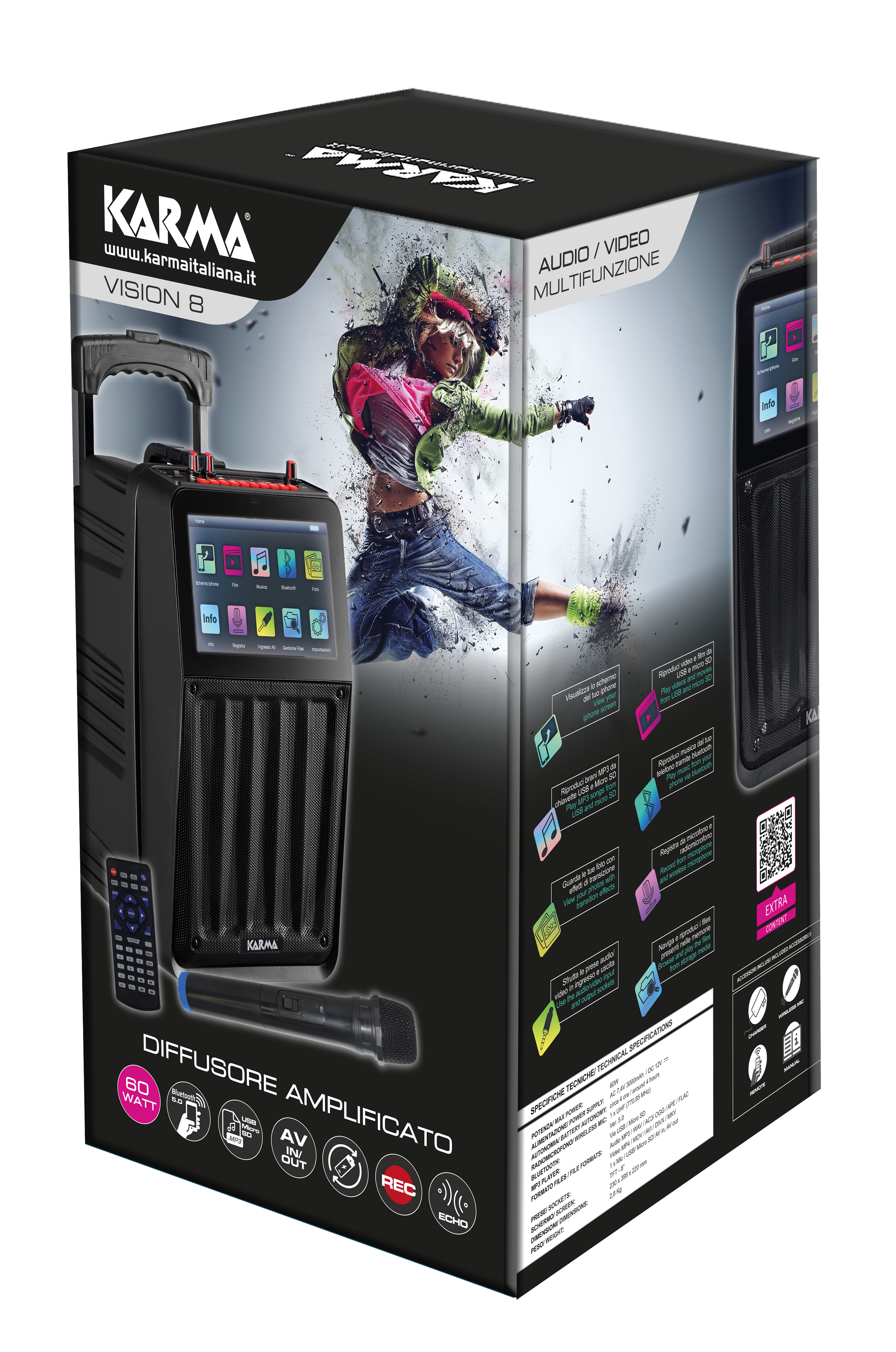 Karma Italiana VISION 8. Potenza in uscita (RMS): 30 W, Formati audio supportati: AC3, APE, FLAC, M4A, MP3, OGG, WAV. Tipo di speaker: 1-via, Amplificatore: Da Incasso, Diametro del woofer: 20,3 cm (8"). Tipo: Sistema PA trolley, Colore del prodotto: Nero, Materiale della scocca: Acrilonitrile butadiene stirene (ABS). Controllo del volume: Manopola. Tecnologia di connessione: Con cavo e senza cavo, Tipi schede di memoria: MicroSD (TransFlash)