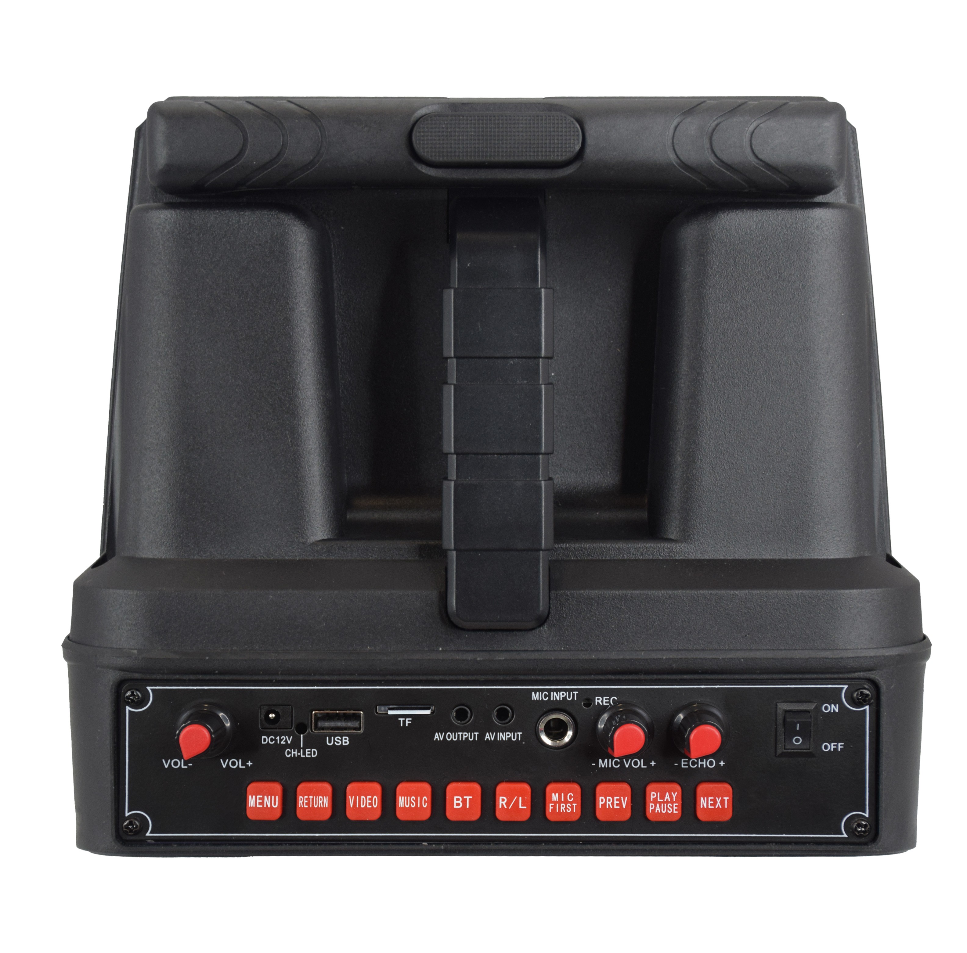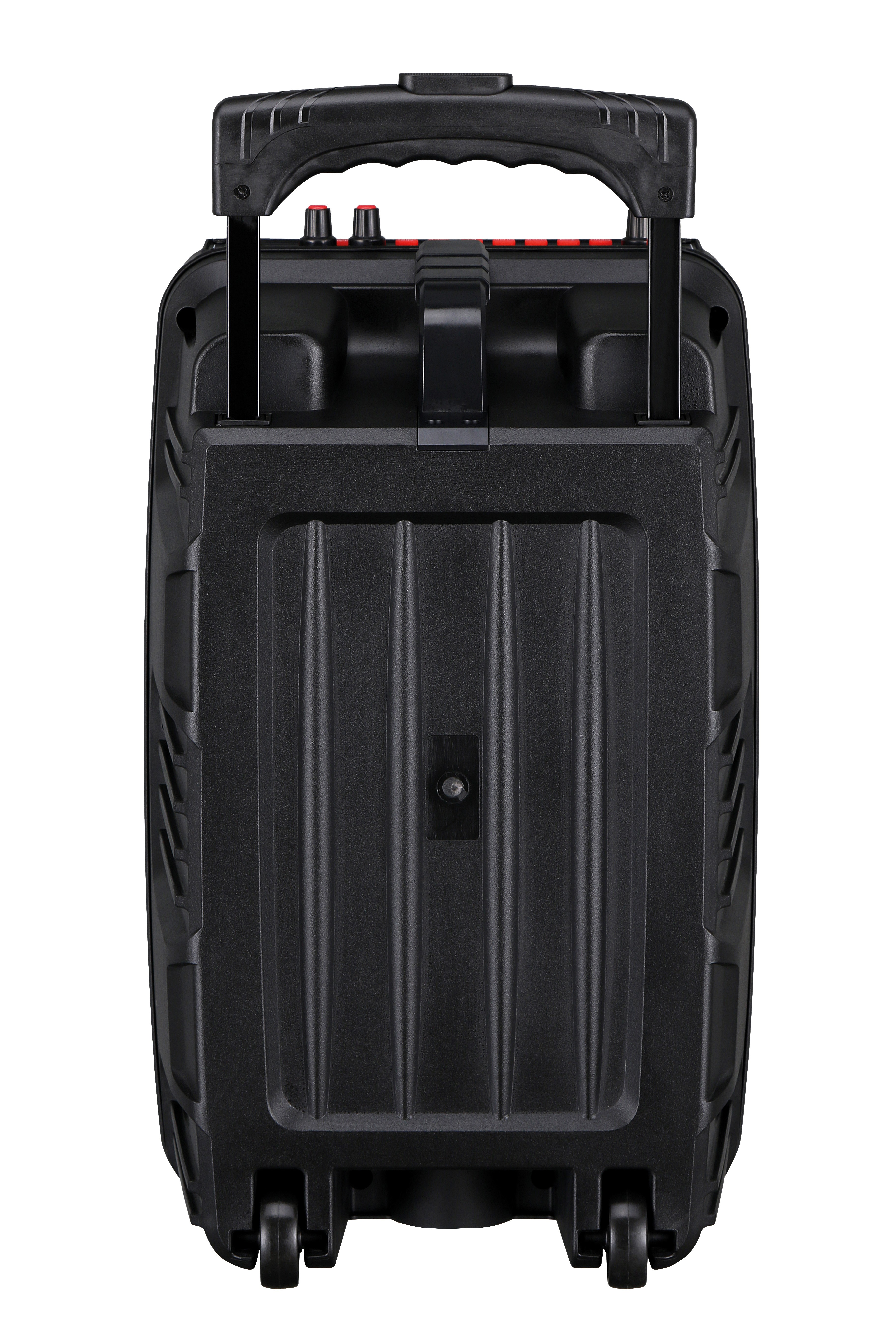 Diffusore amplificato leggero ma potente. Utilizzabile ovunque in completa libertà grazie alla batteria ricaricabile interna che garantisce oltre 4 ore di autonomia. Include, oltre all'alimentatore, un pratico radiomicrofono UHF e un telecomando per il controllo a distanza. L'ampio schermo permette di gestire le numerose funzioni. E' in grado di riprodurre sia brani musicali che file video. Può riprodurre fotografie con effetti di transizione programmabili. Può gestire l'audio di uno smartphone tramite bluetooth 5.0 e gestisce audio/video sia in entrata che in uscita tramite prese standard 3,5mm. Collegando tramite USB un iPhone (VERSIONE iOS 13 O INFERIORE ) potrete duplicare lo schermo per sfruttare ad esempio le app del cellulare per fare karaoke o amplificare l'audio di un film. Presenta comando per effetto eco, può registrare direttamente su USB e dispone persino del sistema trolley e del foro per supporti a treppiede.