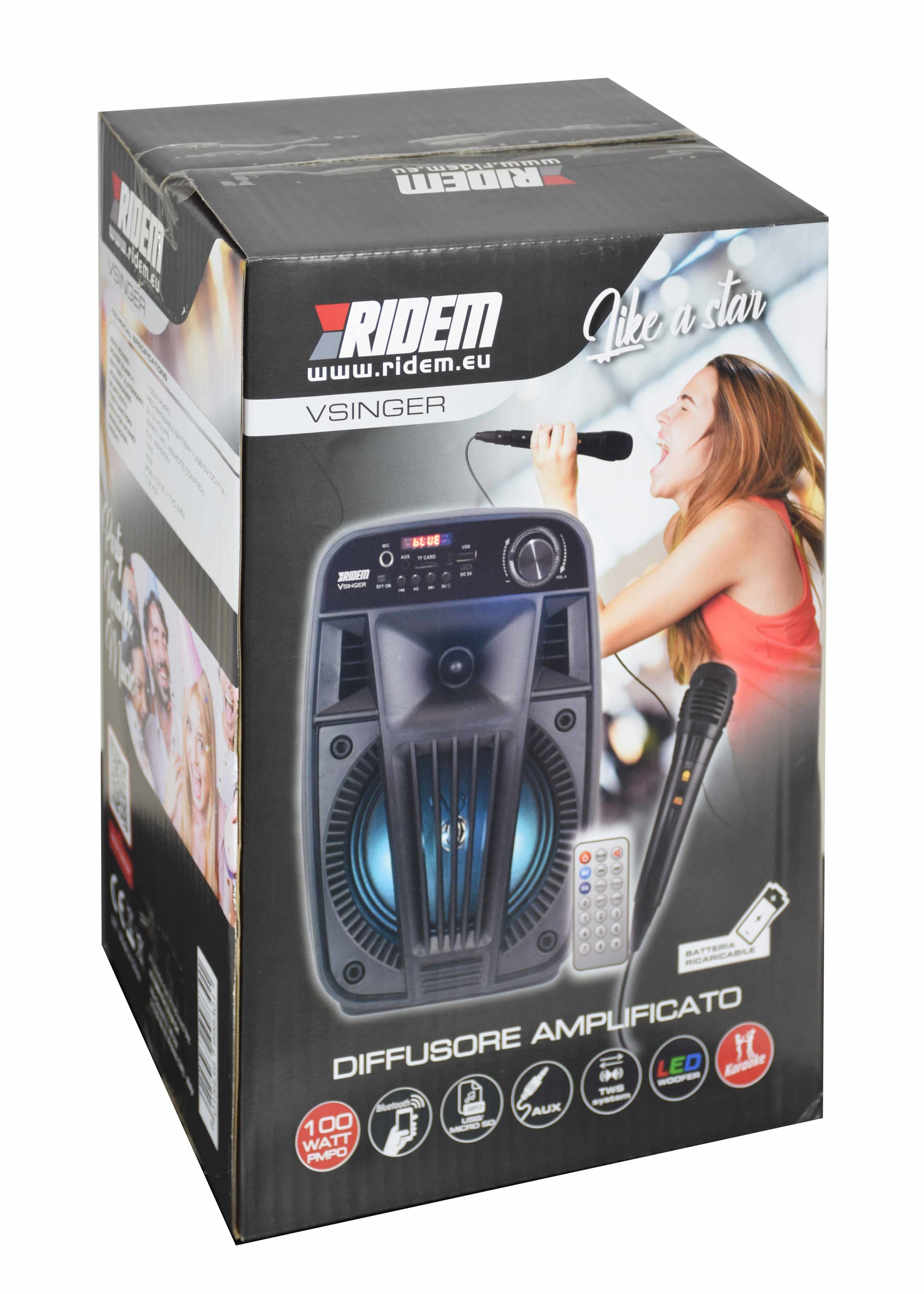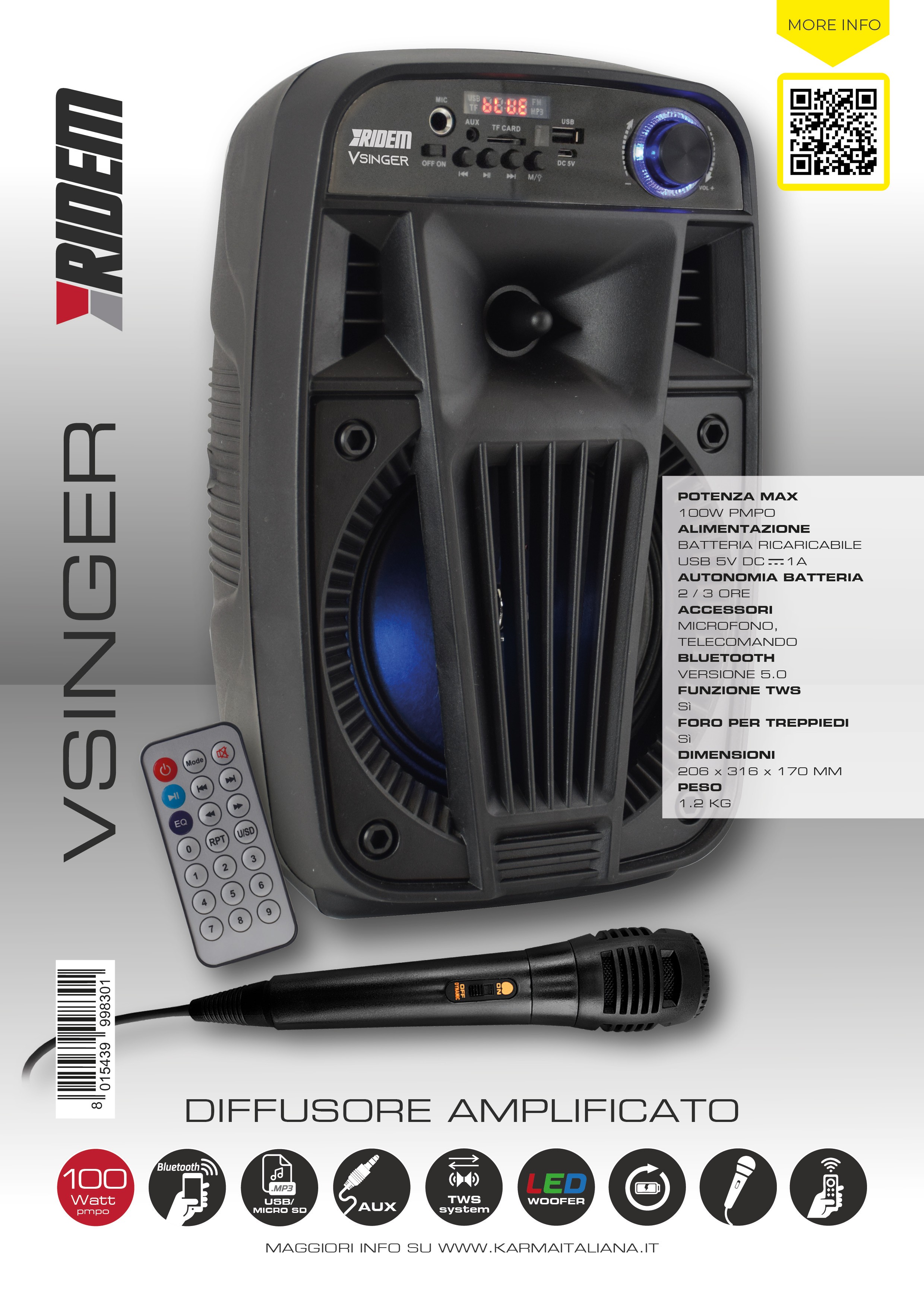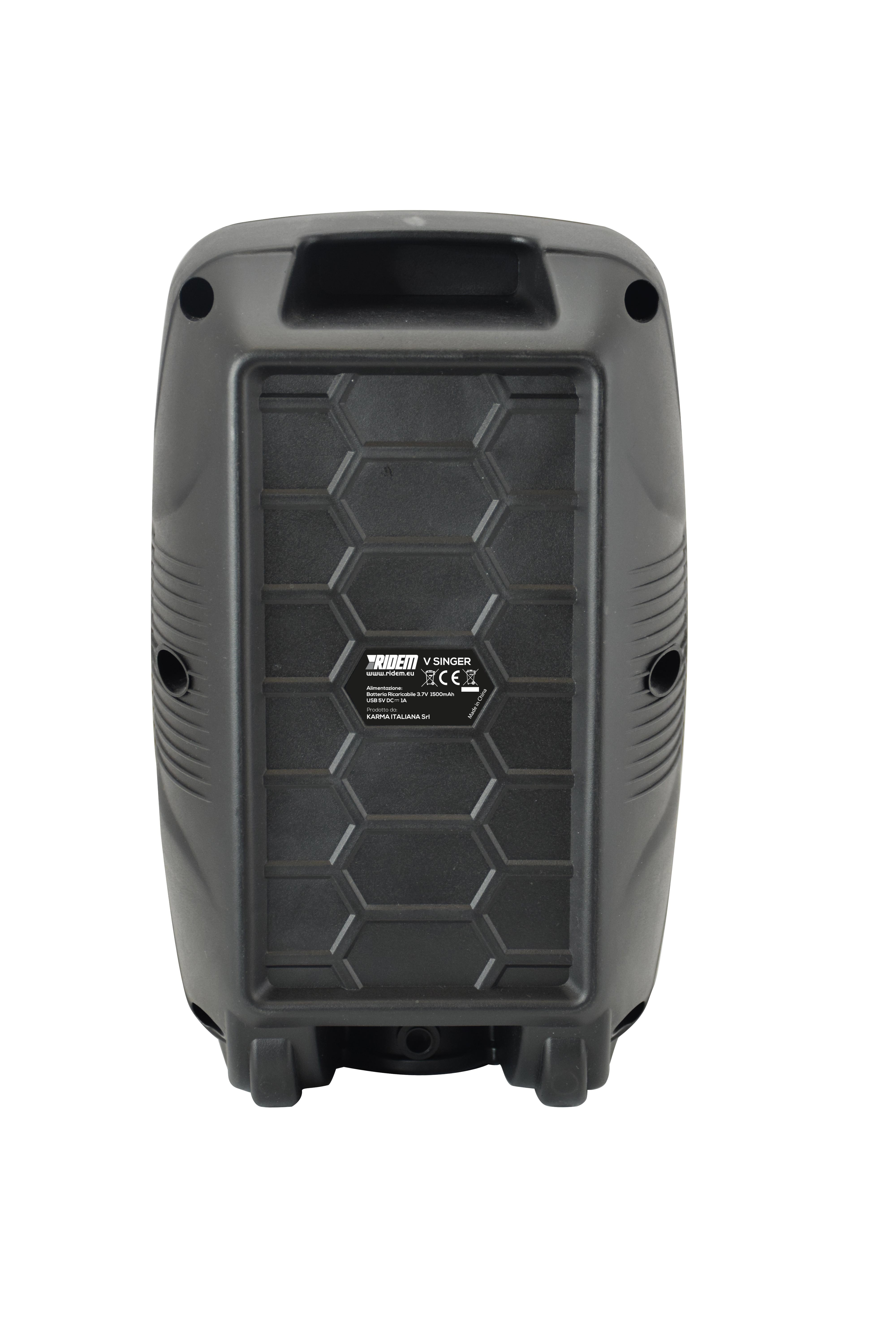 Karma Italiana V Singer. Potenza in uscita (RMS): 12 W, Range di frequenza: 20 - 18000 Hz, PMPO (Potenza musicale di picco): 100 W. Amplificatore: Da Incasso, Diametro del woofer: 16,5 cm (6.5"), Diametro del woofer: 16,3 cm. Tipo: Sistema PA indipendente, Colore del prodotto: Nero, Materiale della scocca: Acrilonitrile butadiene stirene (ABS). Controllo del volume: Manopola. Tecnologia di connessione: Con cavo e senza cavo, Tipi schede di memoria: MicroSD (TransFlash)