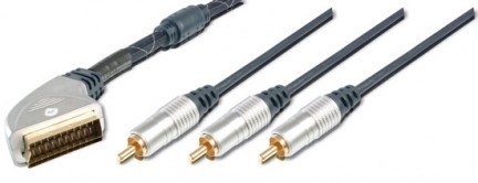 Cavo per il trasporto del segnale audio analogico dalla sorgente all’amplificatore audio/video. ALTA QUALITA' CONTATTI DORATI Connettori : - 1 x SCART 21P M - 3 x RCA M - Selettore per la scelta della direzione del segnale - Lunghezza cavo: mt. 5