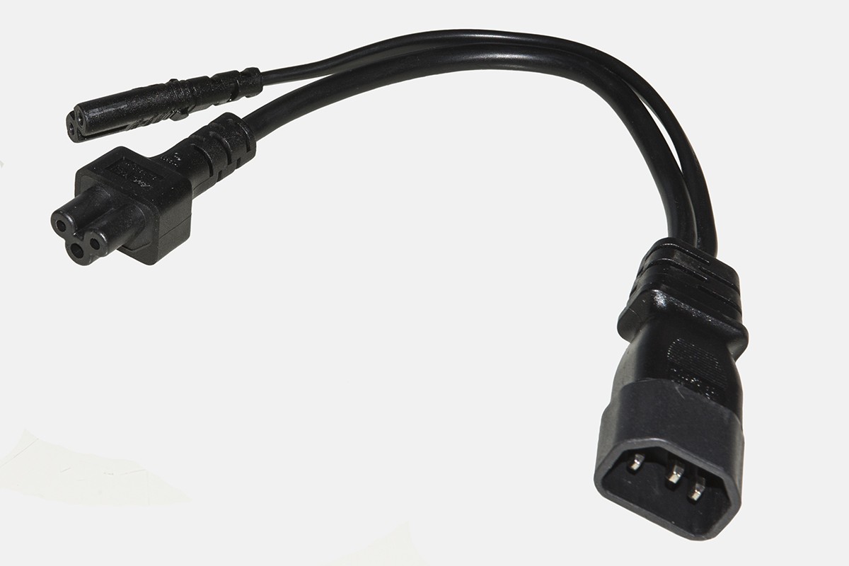 Adattatore di alimentazione, sdoppia la corrente da una presa C13, tipo quella che si trova sugli alimentatori dei PC, in due connettori C5, ad esempio sui caricabatteria per notebook, e una C7.Da una presa si possono quindi collegare due dispositivi.Colore nero.