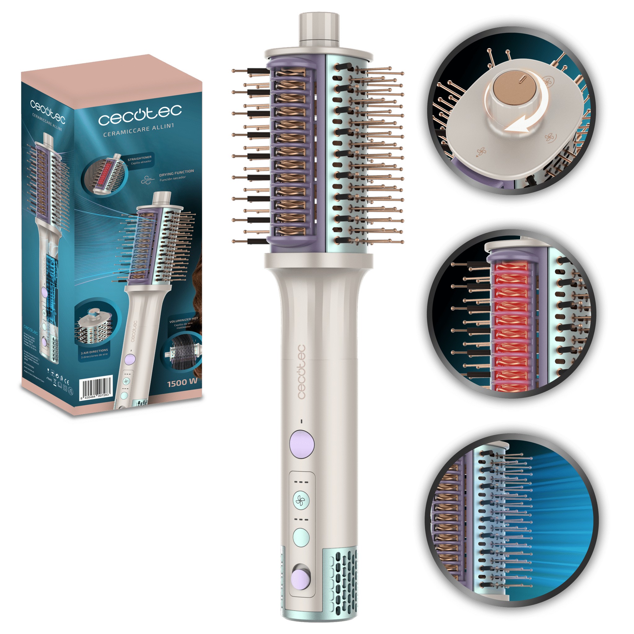 Cecotec CeramicCare Allin1. Tipo: Spazzola ad aria calda, Tecnologia: Vapore, Tipo di controllo: Manopola. Colore del prodotto: Bianco. Potenza: 1500 W, Alimentazione: AC