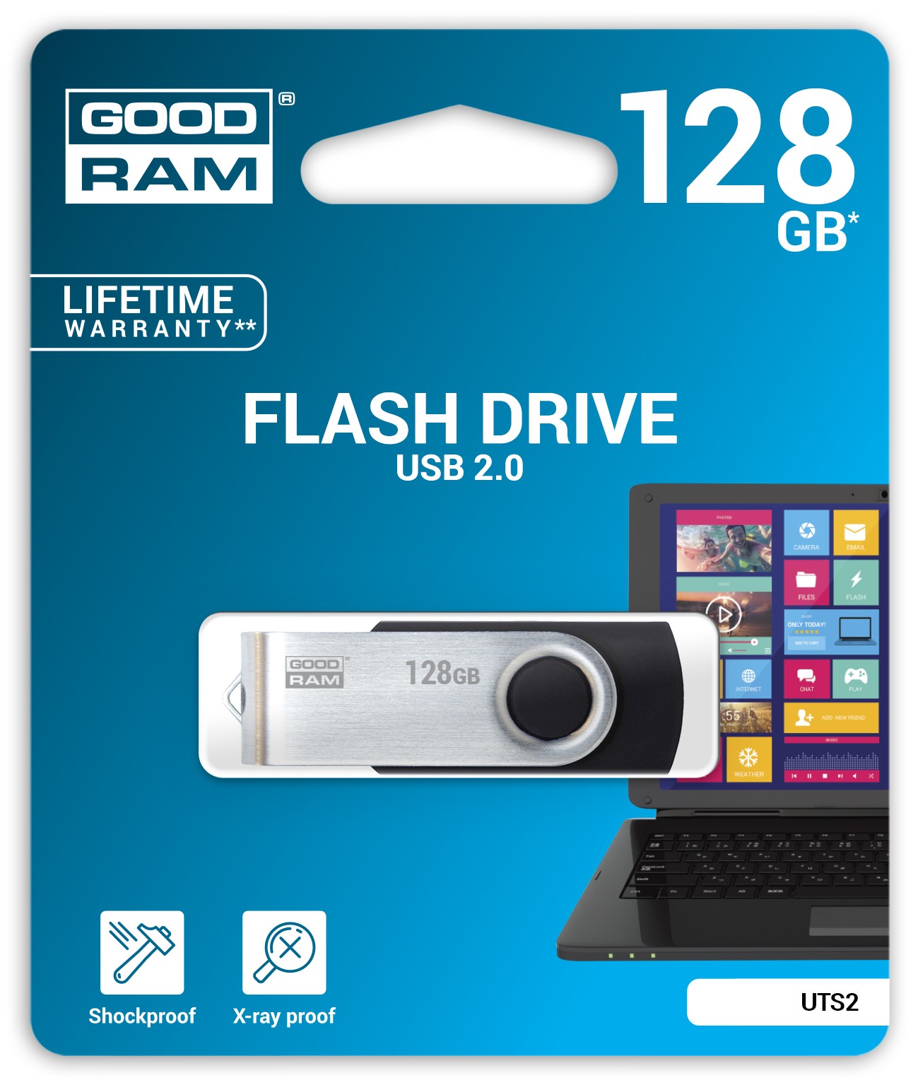 Goodram UTS2-1280K0R11, 128 GB, USB tipo A, 2.0, 20 MB/s, Girevole, Nero, Argento