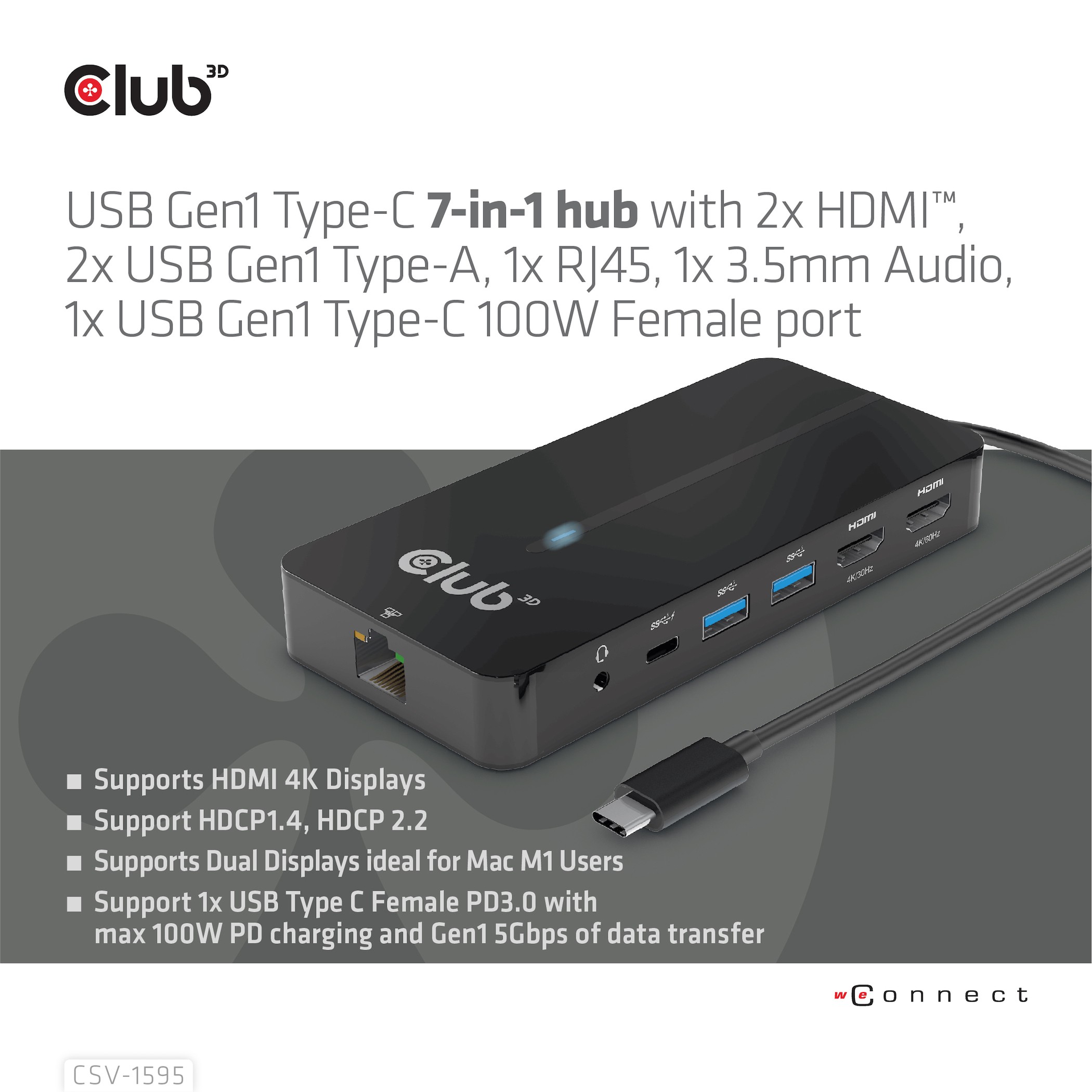 CLUB3D CSV-1595. Interfaccia host: USB 3.2 Gen 1 (3.1 Gen 1) Type-C, Fornitura di alimentazione USB fino a: 100 W. Velocità trasferimento Ethernet LAN: 10,100,1000 Mbit/s. Colore del prodotto: Nero, Tipologia HD: 4K Ultra HD, Tempo massimo di refresh: 60 Hz. Voltaggio di uscita: 5 V, Corrente d'uscita: 1,5 A, Consumo energetico (max): 7,5 W. Larghezza: 140 mm, Profondità: 65 mm, Altezza: 19 mm