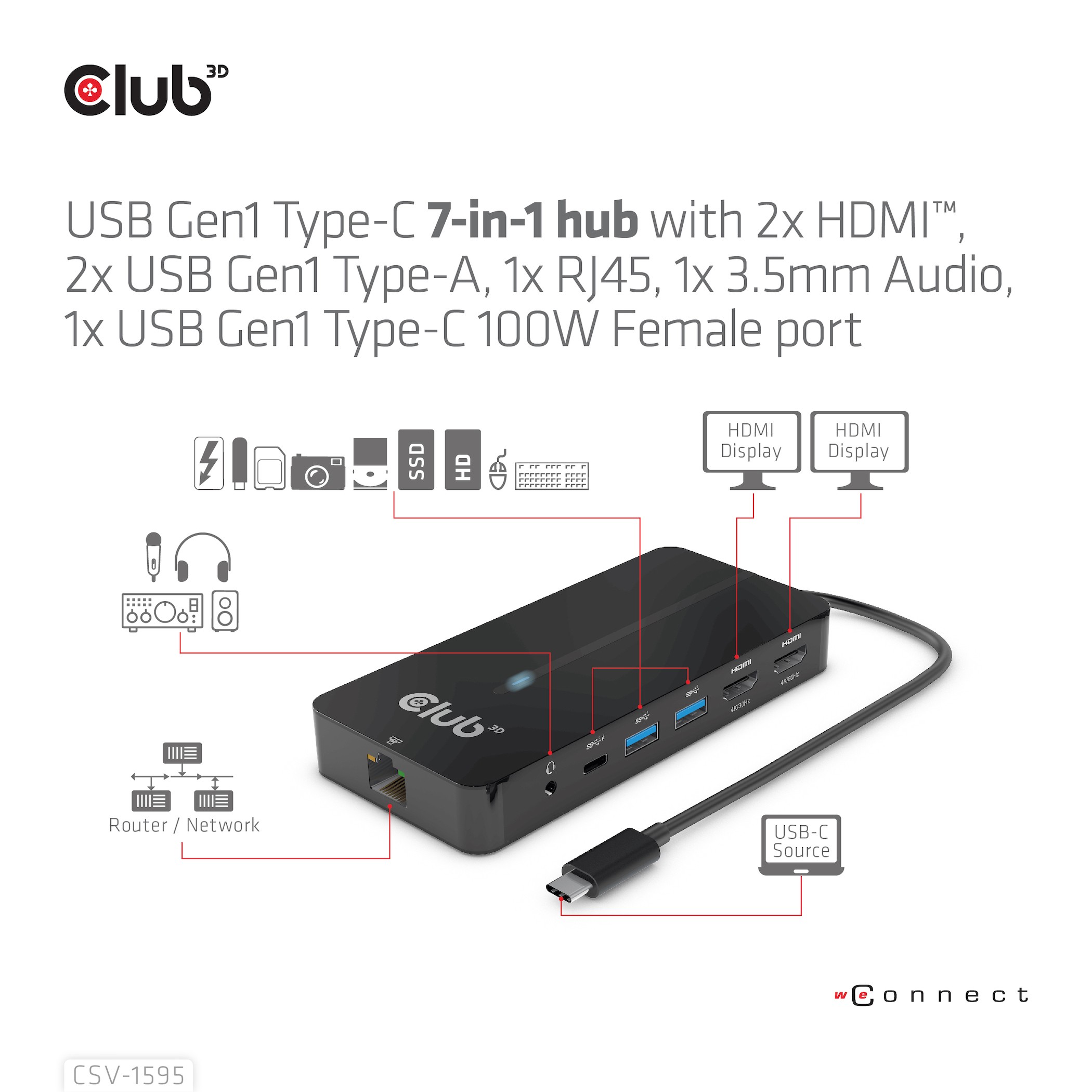 CLUB3D CSV-1595, USB 3.2 Gen 1 (3.1 Gen 1) Type-C, 100 W, 10,100,1000 Mbit/s, Nero, 4K Ultra HD, 60 Hz