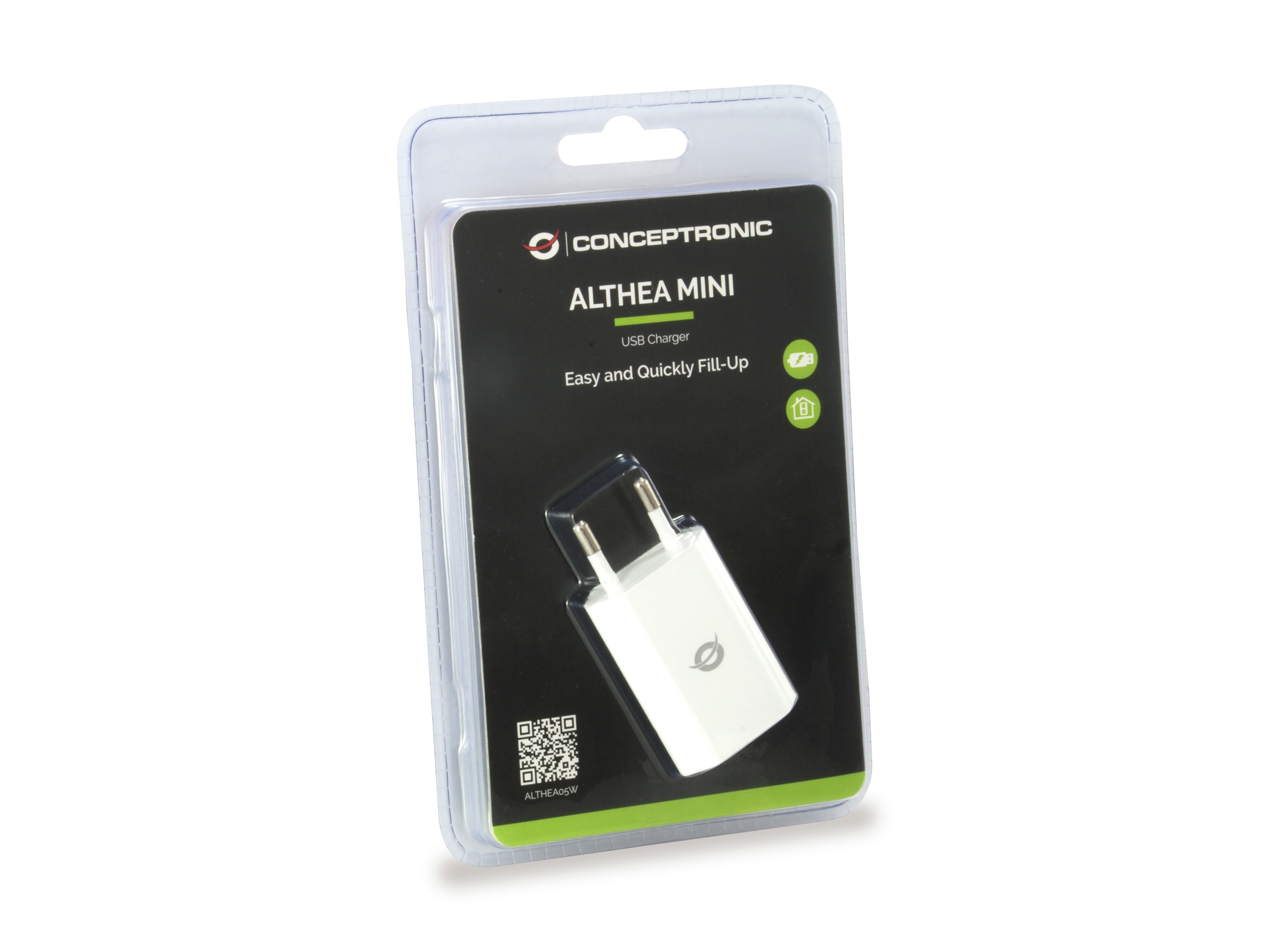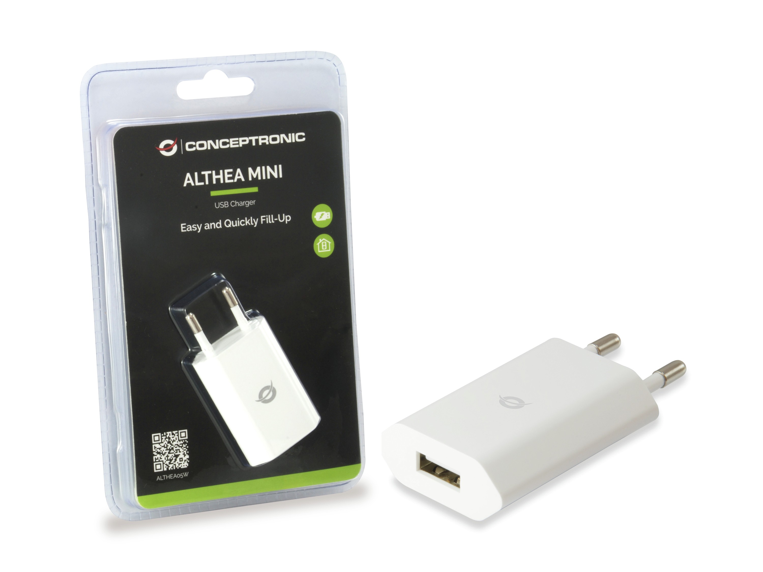 Conceptronic ALTHEA05W. Tipo di caricatore: Interno, Tipologia alimentazione: AC, Compatibilità caricatore: Universale. Voltaggio di ingresso: 110 - 240 V, Tensione di uscita (max): 5 V. Quantità porte USB 2.0: 1. Colore del prodotto: Bianco