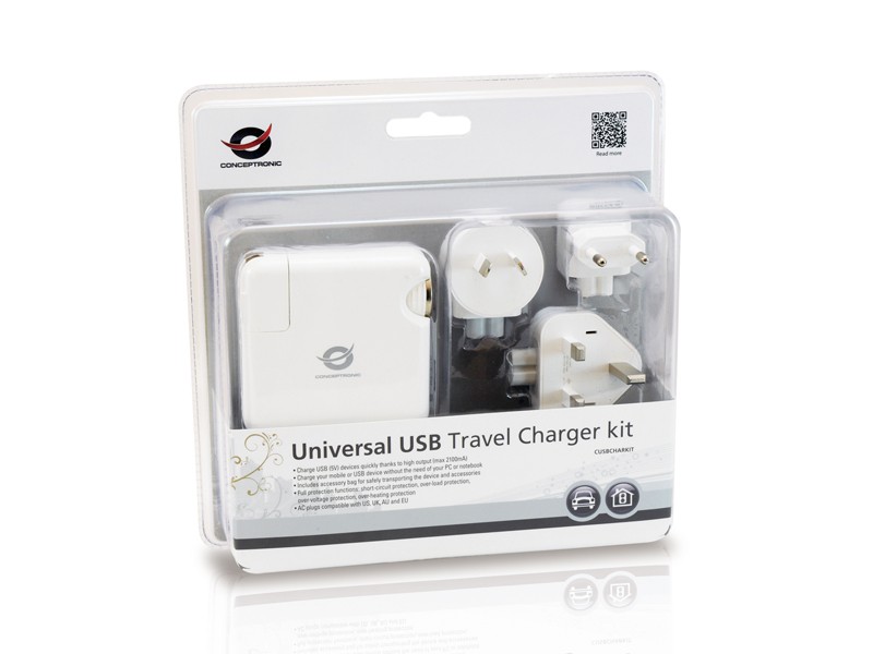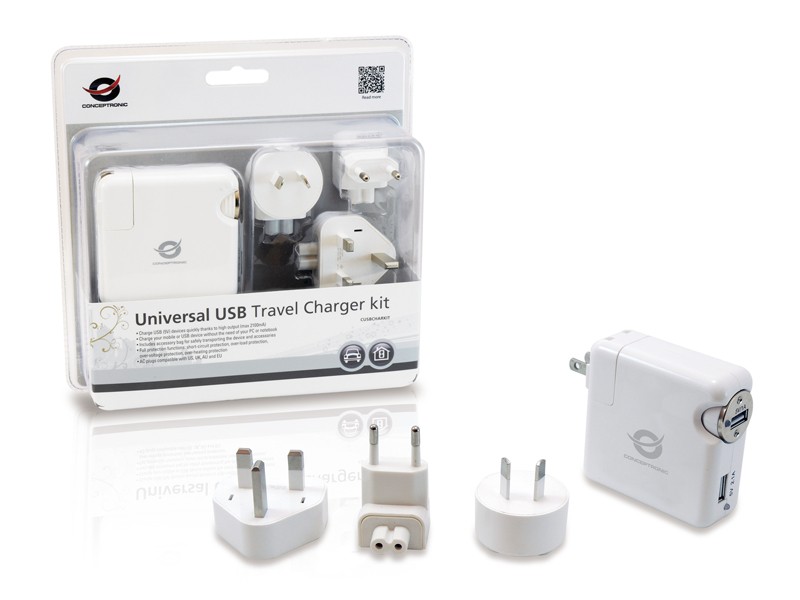 Conceptronic CUSBCHARKIT. Tipo di caricatore: Auto, Interno, Tipologia alimentazione: AC, Accendisigari, Compatibilità caricatore: Fotocamera, Computer portatile, PDA, Smartphone, Tablet. Voltaggio di ingresso: 100 - 240 V, Tensione di uscita (max): 5 V. Quantità porte USB 2.0: 2. Colore del prodotto: Bianco
