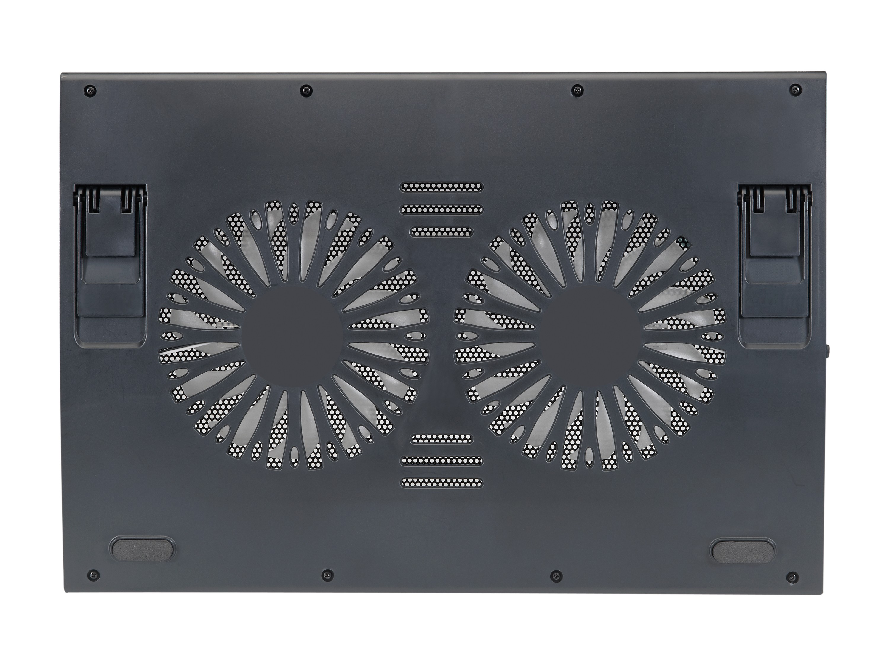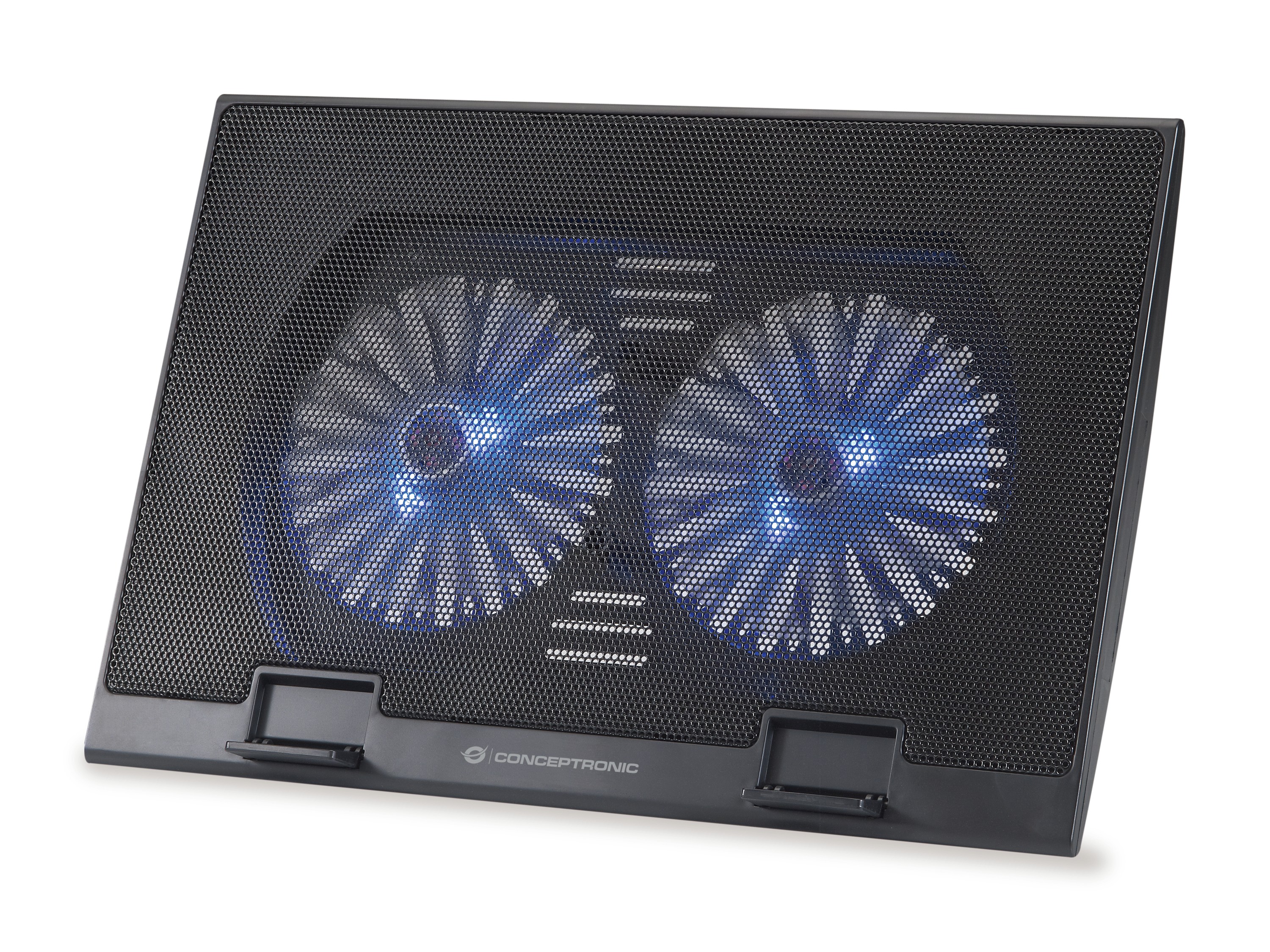 Conceptronic THANA02B. Capienza massima dimensioni dello schermo: 43,2 cm (17"), Numero di ventilatori già presenti: 2 pz, Diametro del ventilatore: 12,5 cm. Colore del prodotto: Nero, Materiali: Ferro, Plastica, colore d'illuminazione: Blu. Interfaccia host: USB. Tipologia alimentazione: USB, Voltaggio di ingresso: 5 V. Larghezza: 380 mm, Profondità: 260 mm, Altezza: 23 mm