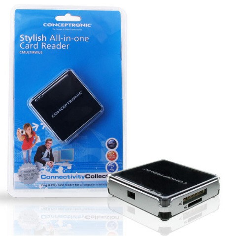 Conceptronic USB 2.0 All in One memory card reader/writer, CF, microSDHC, MMC, MS Duo, MS PRO, SD, SDHC, xD, Nero, Windows XP/Vista/7, USB 2.0, -10 - 65 °C, 60 mm