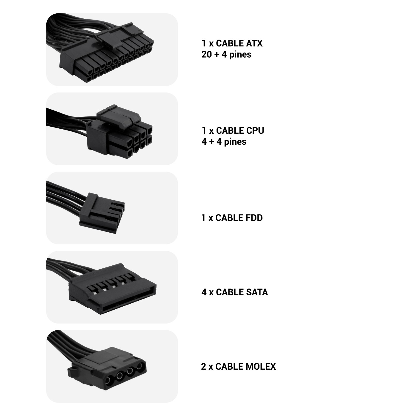 CoolBox BASIC 500GR. Potenza totale: 500 W, Tensione di ingresso AC: 220 - 240 V, Frequenza di ingresso AC: 50 Hz. Connettore scheda madre: 20+4 pin ATX, Tipo di cablaggio: Non modulare. Utilizzo: PC, Fattore di forma dell'unità di alimentazione (PSU): ATX. Colore del prodotto: Nero, Tipo di raffreddamento: Attivo, Diametro del ventilatore: 12 cm. Cavi inclusi: AC