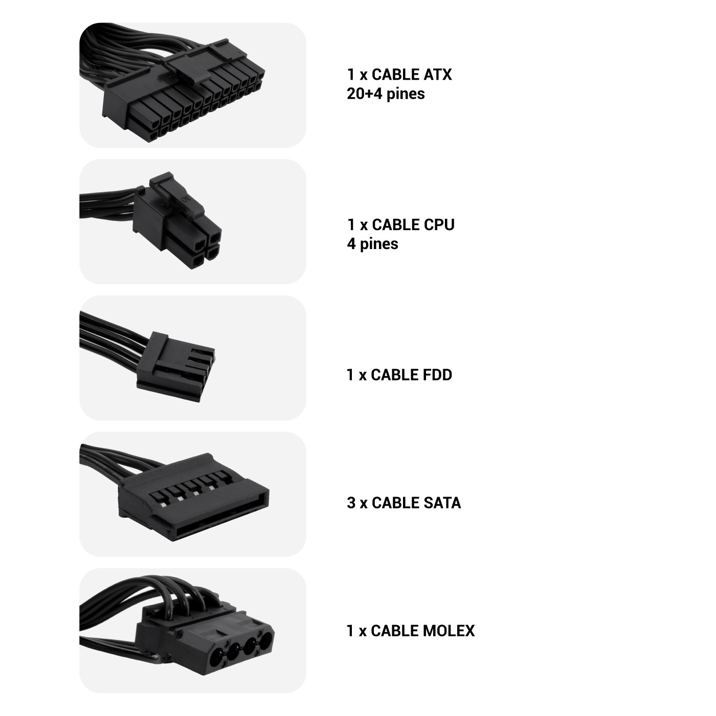 CoolBox BASIC500GR-S. Potenza totale: 500 W, Tensione di ingresso AC: 230 V, Corrente d'ingresso: 2.5 A. Connettore scheda madre: 20+4 pin ATX, Tipo di cablaggio: Non modulare. Utilizzo: PC, Fattore di forma dell'unità di alimentazione (PSU): SFX, Tempo medio tra guasti (MTBF): 100000 h. Colore del prodotto: Bianco, Tipo di raffreddamento: Attivo, Diametro del ventilatore: 8 cm. Certificati di conformità: RoHS, Certificazione: CE, Eco-raee