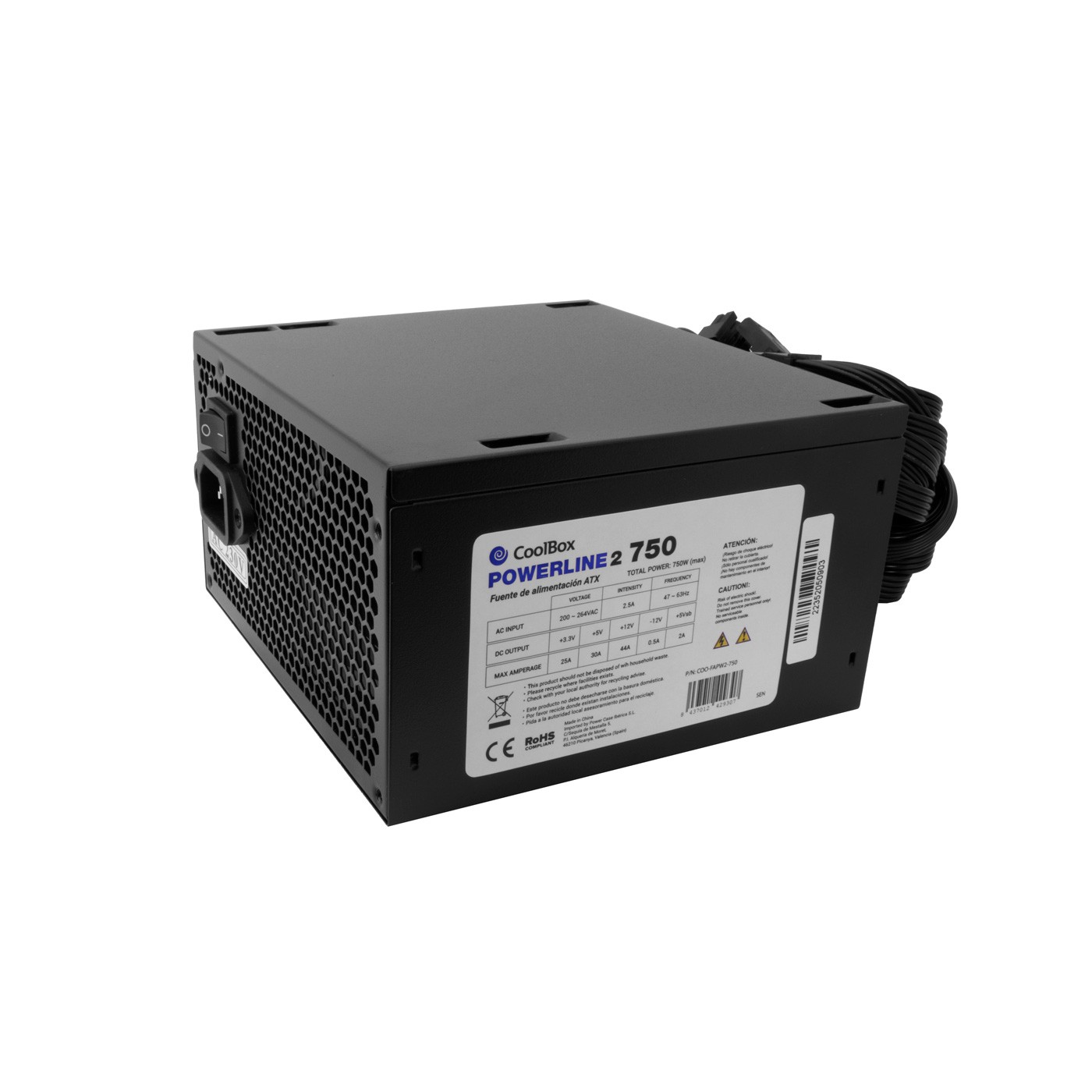 CoolBox COO-FAPW2-750. Potenza totale: 750 W, Tensione di ingresso AC: 200 - 264 V, Frequenza di ingresso AC: 47 - 63 Hz. Connettore scheda madre: 20+4 pin ATX, Lunghezza del cavo di alimentazione della scheda madre: 50 cm, Lunghezza del cavo di alimentazione SATA: 500,650 mm. Utilizzo: PC, Fattore di forma dell'unità di alimentazione (PSU): ATX, Fattore di forma scheda madre supportato: ATX. Colore del prodotto: Nero, Tipo di raffreddamento: Attivo, Diametro del ventilatore: 12 cm. Cavi inclusi: AC