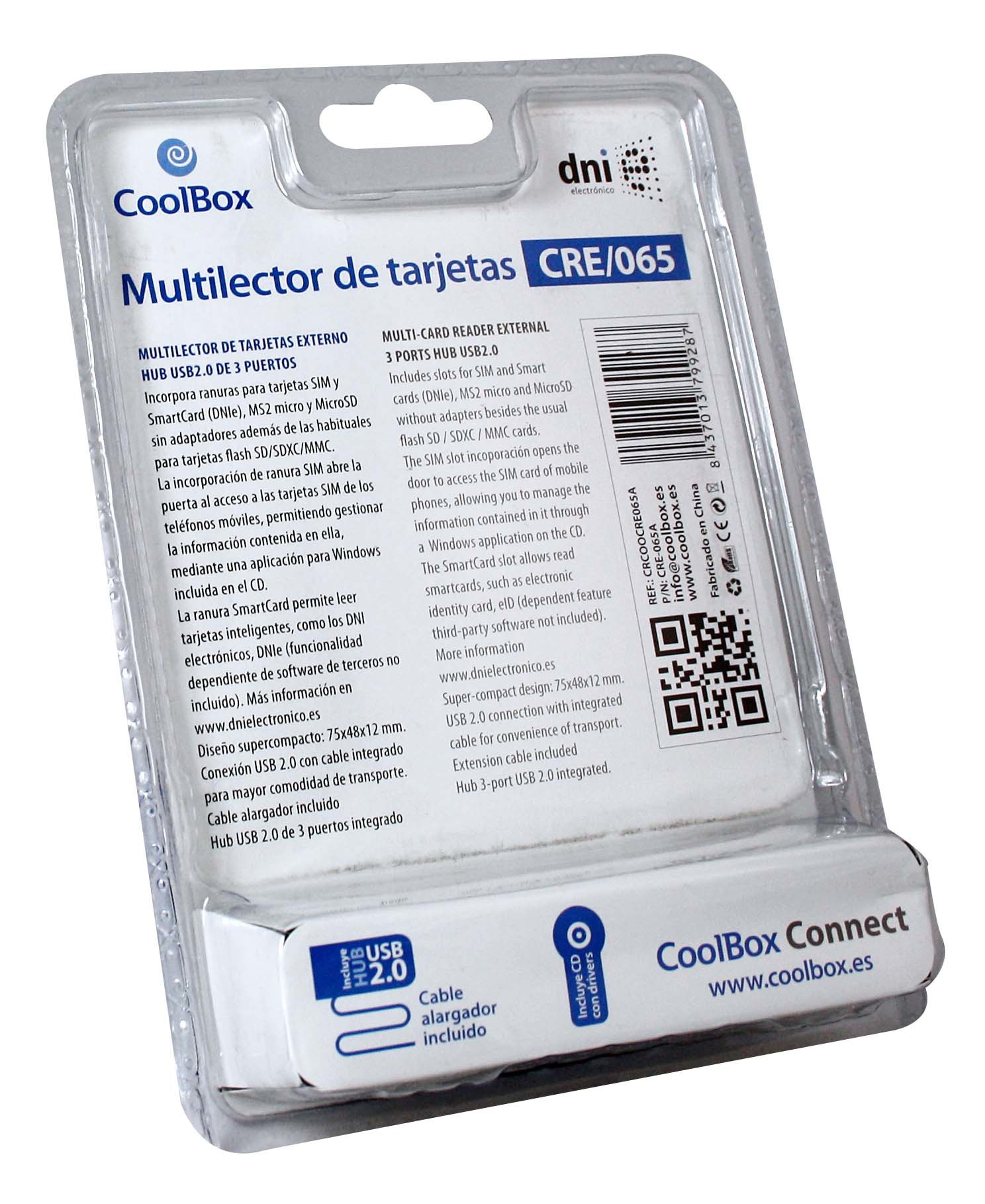 CoolBox CRE-065. Tipi schede di memoria: Memory Stick (MS), microSDXC, miniSD, MMC, MS Duo, MS Micro (M2), MS PRO Duo, SD, SDHC, SDXC, Colore del prodotto: Nero, Velocità di trasferimento dati: 480 Mbit/s. Interfaccia: USB 2.0. Tipologia alimentazione: USB. Larghezza: 75 mm, Profondità: 48 mm, Altezza: 12 mm. Cavi inclusi: USB