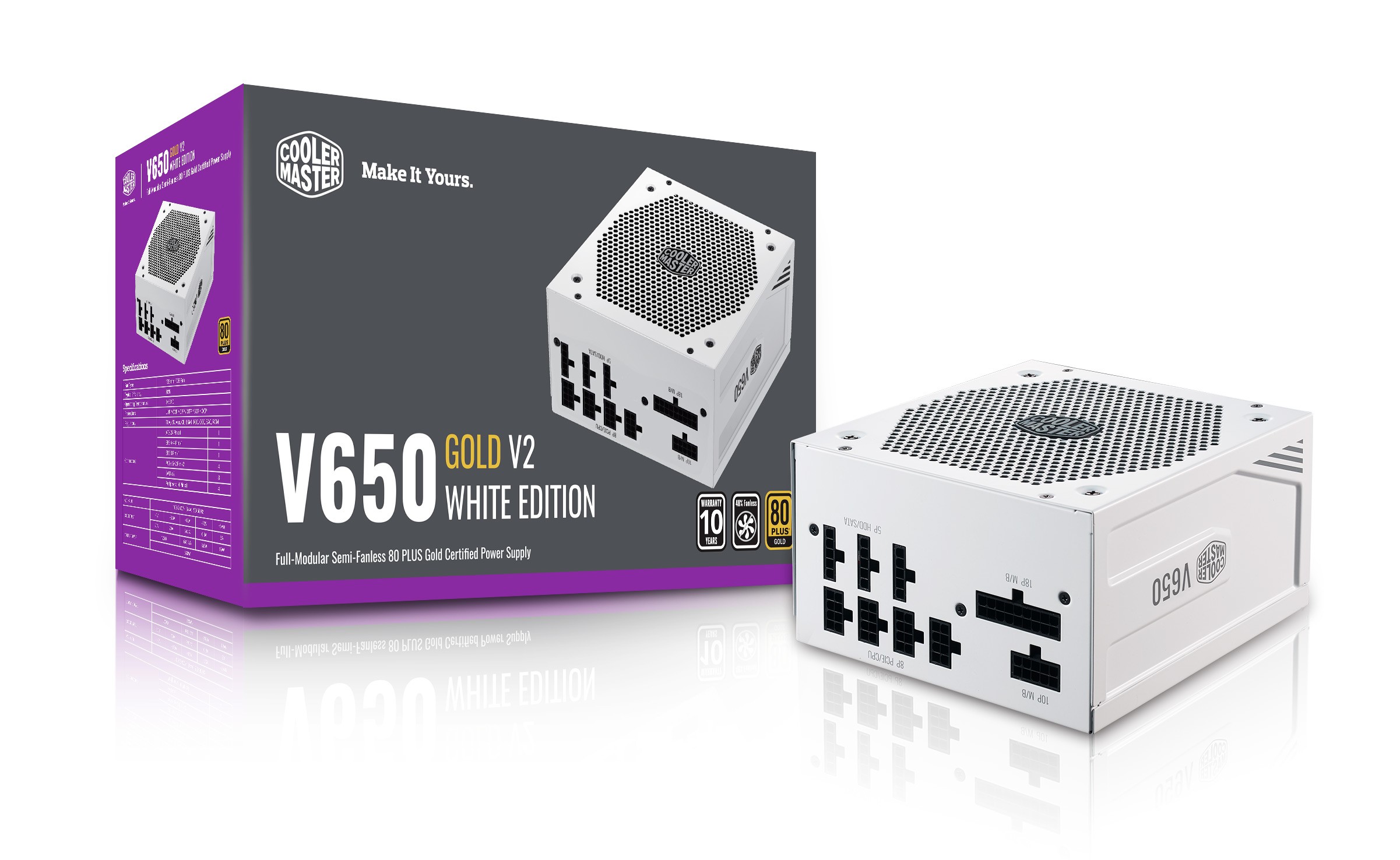 Cooler Master V650 Gold-V2 White Edition. Potenza totale: 650 W, Tensione di ingresso AC: 100 - 240 V, Frequenza di ingresso AC: 50/60 Hz. Connettore scheda madre: 24-pin ATX, Tipo di cablaggio: Modulare. Utilizzo: PC, Fattore di forma dell'unità di alimentazione (PSU): ATX, Certificazione 80 PLUS: 80 PLUS Gold. Colore del prodotto: Bianco, Tipo di raffreddamento: Attivo, Diametro del ventilatore: 13,5 cm. Larghezza: 150 mm, Profondità: 160 mm, Altezza: 86 mm
