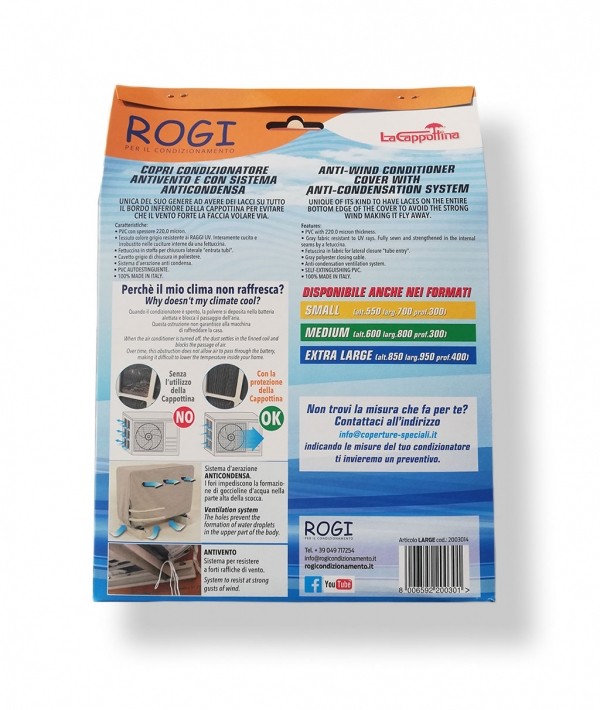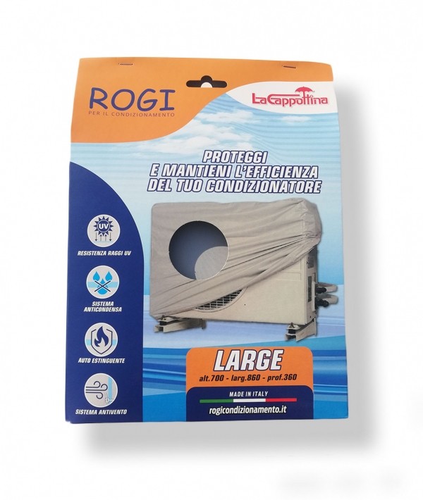 Rogi 2003014. Tipo di prodotto: Copertura per climatizzatore, Colore del prodotto: Grigio, Materiali: Cloruro di polivinile (PVC). Larghezza: 860 mm, Profondità: 360 mm, Altezza: 700 mm. Paese di origine: Italia