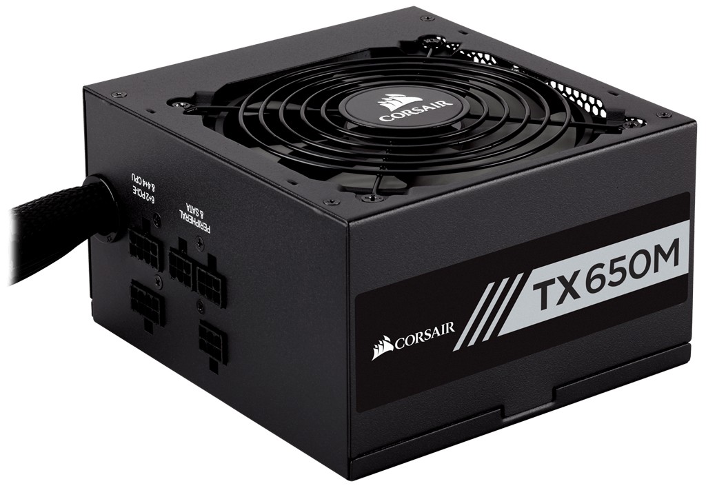 Corsair TX650M. Potenza totale: 650 W, Tensione di ingresso AC: 100 - 240 V, Frequenza di ingresso AC: 47 - 63 Hz. Connettore scheda madre: 20+4 pin ATX, Lunghezza del cavo di alimentazione della scheda madre: 61 cm, Lunghezza del cavo di alimentazione SATA: 500,600 mm. Utilizzo: PC, Fattore di forma dell'unità di alimentazione (PSU): ATX, Certificazione 80 PLUS: 80 PLUS Gold. Colore del prodotto: Nero, Tipo di raffreddamento: Attivo, Diametro del ventilatore: 12 cm. Larghezza: 150 mm, Profondità: 140 mm, Altezza: 86 mm
