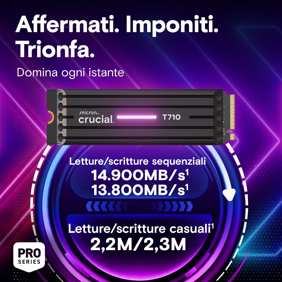 Crucial è all’avanguardia nelle soluzioni di archiviazione Gen5 ad altissima velocità, progettate per le massime prestazioni. Il T710 incarna l’innovazione di Crucial e ridefinisce i limiti del possibile in tema di gaming, creatività e molto altro.