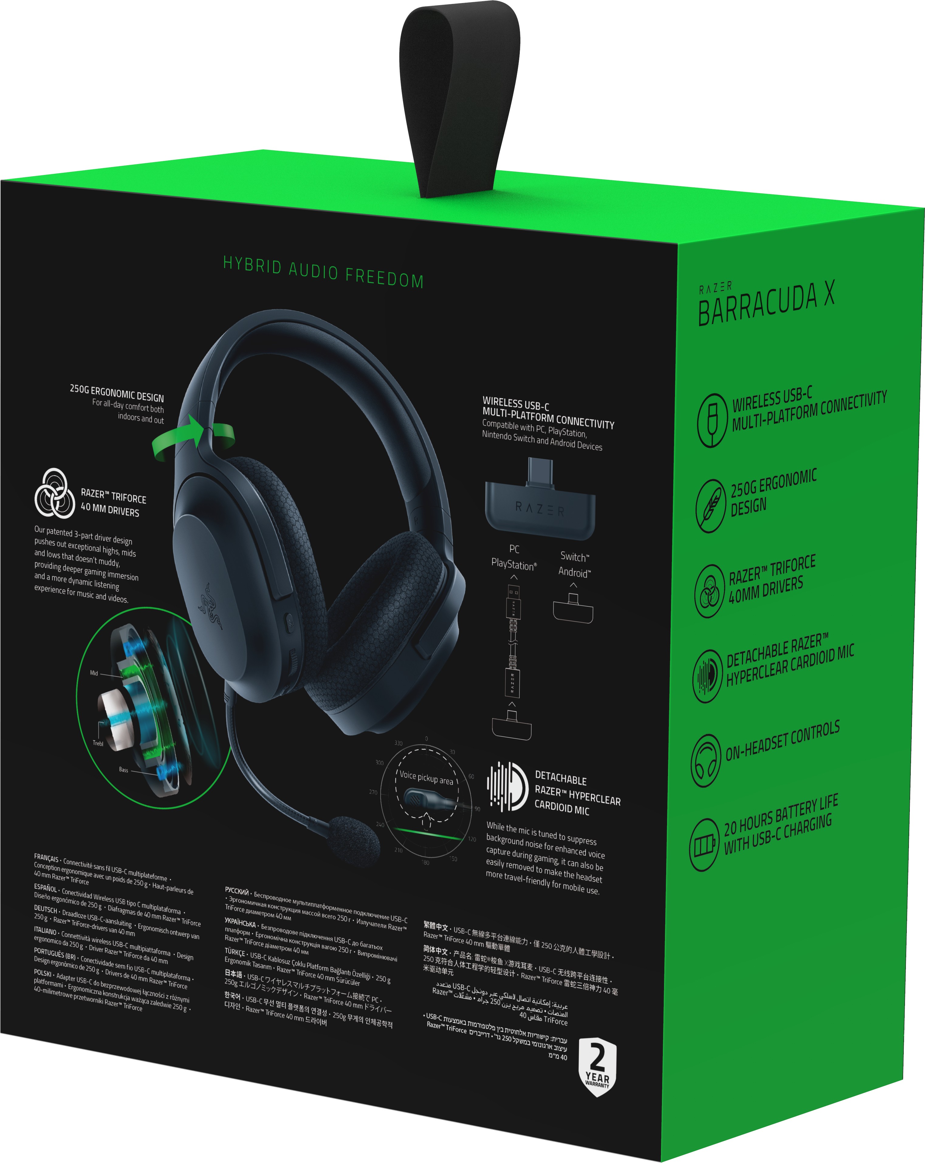Razer BARRACUDA X. Tipo di prodotto: Cuffie. Tecnologia di connessione: Con cavo e senza cavo. Utilizzo raccomandato: Giocare. Frequenza cuffia: 20 - 20000 Hz. Lunghezza cavo: 1,5 m. Peso: 250 g. Colore del prodotto: Nero