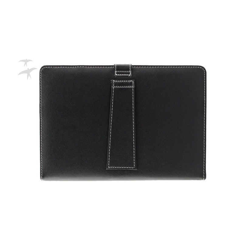 Interamente realizzata in ecopelle. Il sistema di fissaggio del tablet è semplice e sicuro grazie ai 4 ganci. Inoltre, un supporto pieghevole nel retro permette di regolare l'inclinazione del tablet.