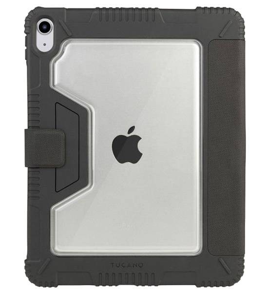 Custodia super protettiva per iPad 10,9" 10a generazione (2022), parzialmente realizzata in plastica riciclata, presenta un guscio posteriore anti-shock formato da un bordo perimetrale in TPU e un'ampia sezione centrale in policarbonato trasparente.