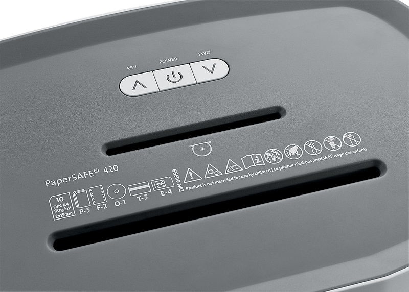 Dahle PS 420. Tipo di sminuzzamento: Triturazione incrociata, Dimensione di sminuzzamento: 2 x 15 mm, Volume cestino: 25 L. Consumi: 350 W, Tensione di ingresso AC: 230 V, Frequenza di ingresso AC: 50 Hz. Larghezza: 443 mm, Profondità: 273 mm, Altezza: 545 mm