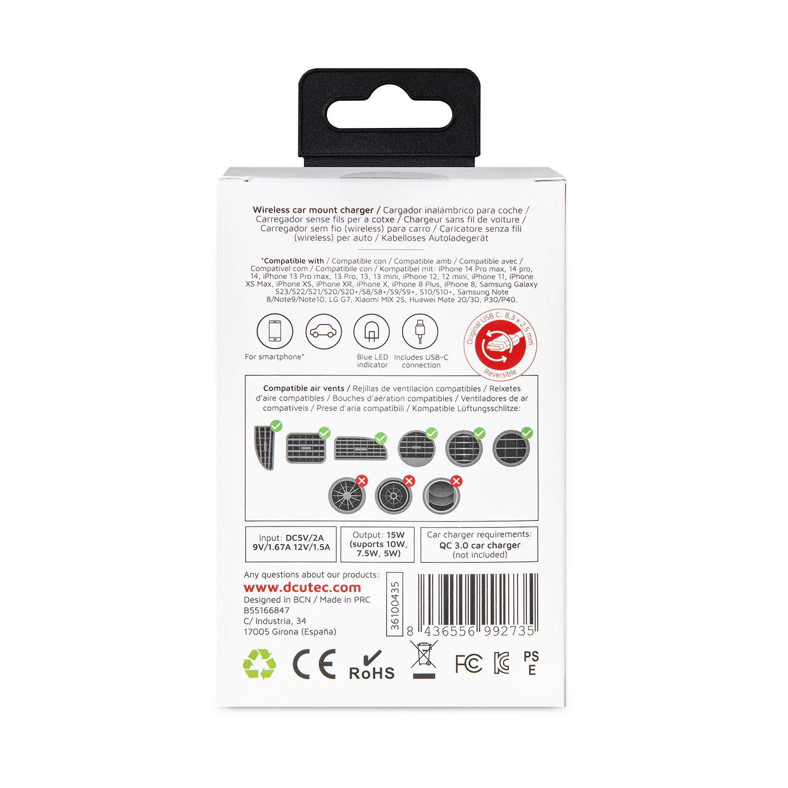 DCU Advance Tecnologic 36100435. Tipo di caricatore: Auto, Tipologia alimentazione: USB, Compatibilità caricatore: Telefono, Carica wireless, Ricarica rapida. Colore del prodotto: Nero
