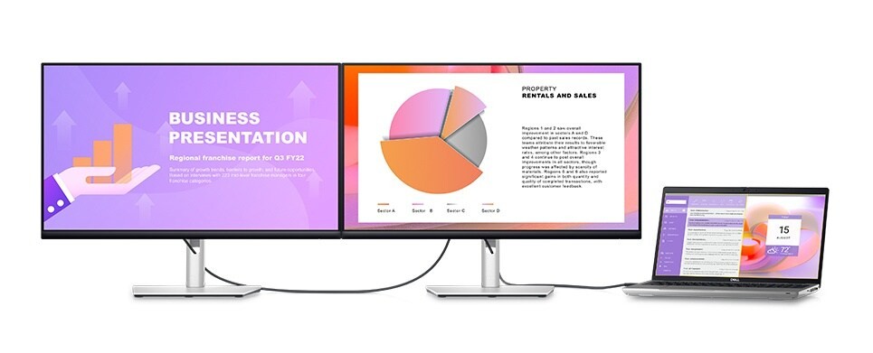 Aumenta l'efficienza: aumenta la produttività fino al 39% espandendo la scrivania con una tastiera, un mouse e collegando i monitor Hub a doppia produttività tramite il collegamento a margherita di Dell Express, una funzione che consente il rilevamento automatico del secondo display, ignorando il passaggio manuale della modifica delle impostazioni OSD. Aumenta l'efficienza ancora di più con gli strumenti per il multitasking di Dell Easy Arrange.