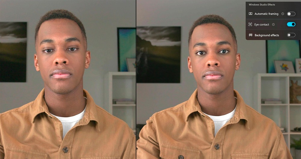 Gli effetti di Windows Studio con funzioni basate sull'intelligenza artificiale ti mantengono costantemente a fuoco con la sfocatura dello sfondo e l'inquadratura automatica e regolano lo sguardo per aiutarti a rimanere connesso con la funzione Eye Contact.