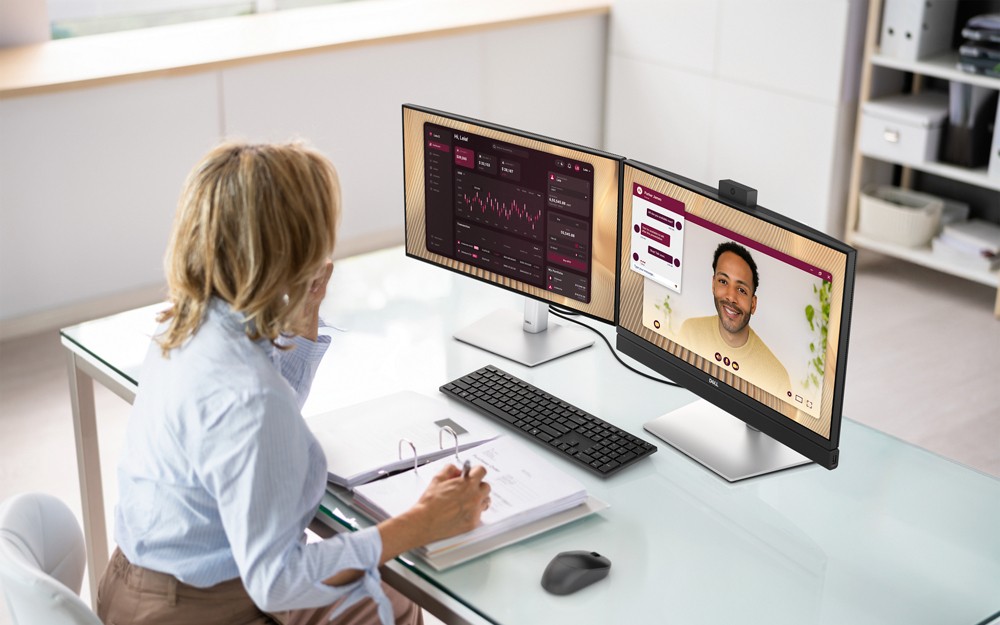 Il suono direttamente dal desktop è forte e chiaro con i microfoni con array digitale integrati e gli altoparlanti ad alte prestazioni con amplificatore intelligente. Adaptive Audio regola gli altoparlanti e i microfoni in base alla vicinanza dell'utente e Intelligent Audio fornisce la cancellazione automatica del rumore in base all'ambiente.