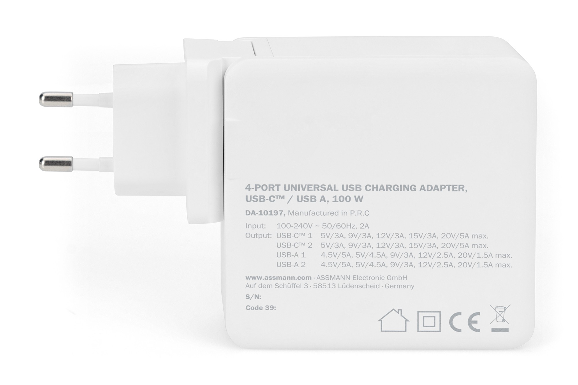 Digitus Adattatore di ricarica universale USB a 4 porte, USB-C™ / USB A, 100 W, GaN, Interno, AC, 20 V, Bianco