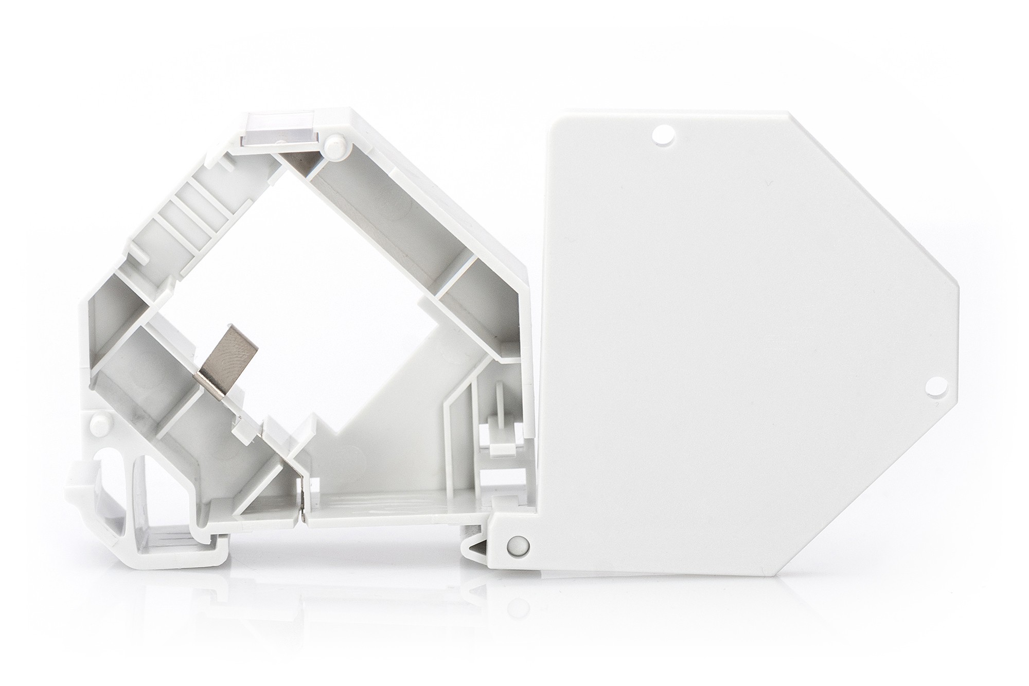 Il modulo Keystone è installato sull'alloggiamento della rotaia. La distanza dell'alloggiamento dalla parete dovrebbe essere di circa 10 mm. Nella cassetta di distribuzione è possibile installare fino a 12 moduli in serie. La protezione IP20 è garantita solo se l'alloggiamento è installato con le coperture. Consegnato senza modulo Keystone.