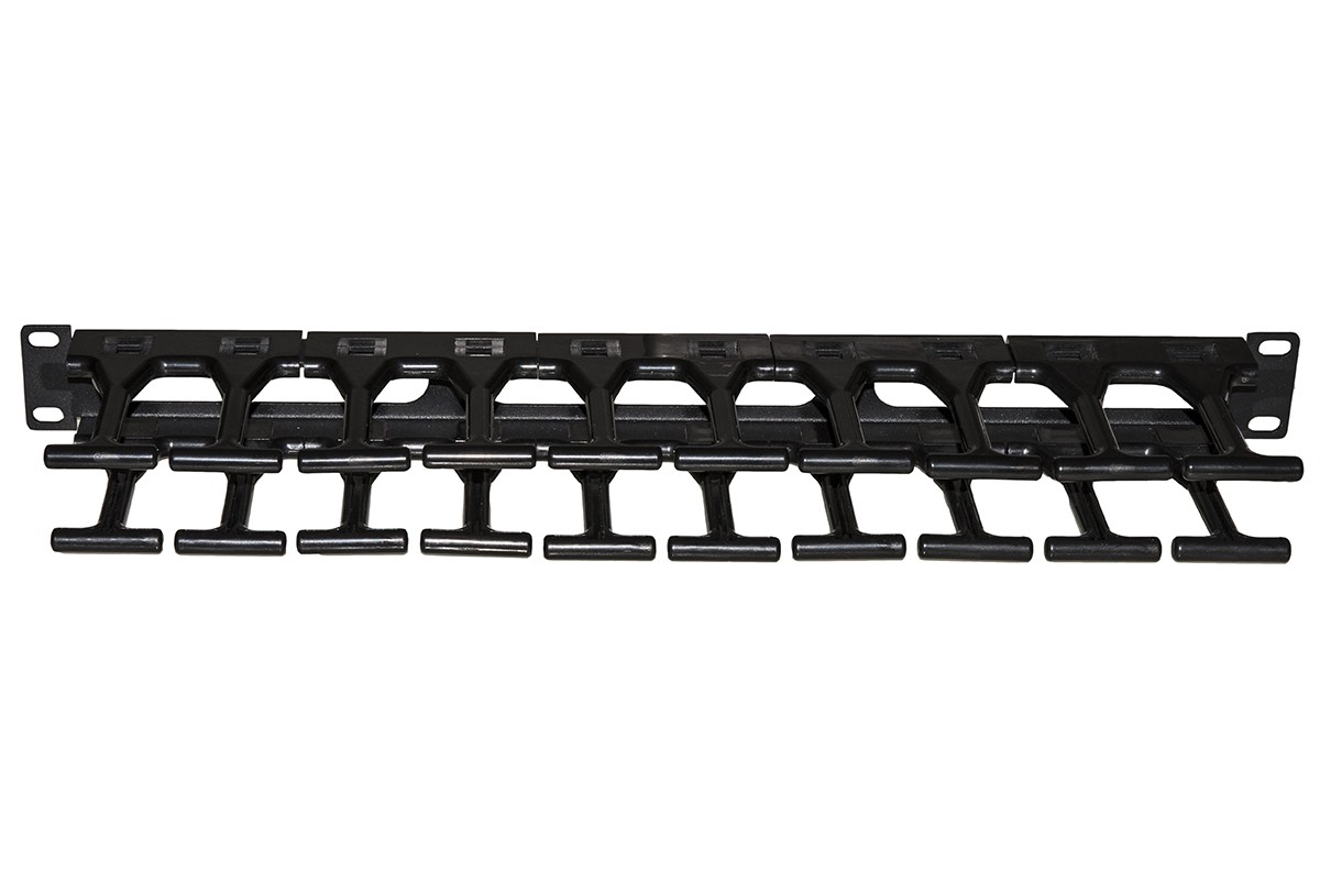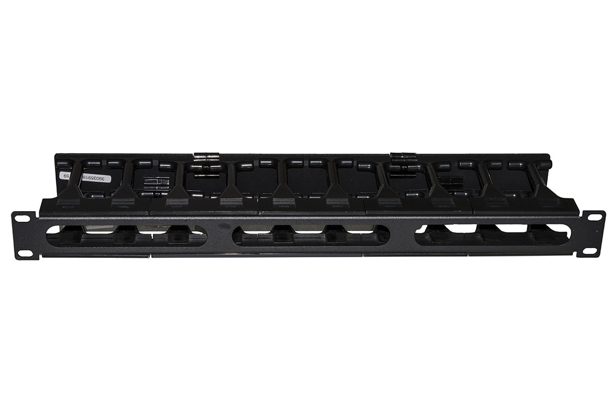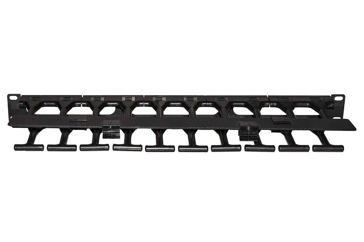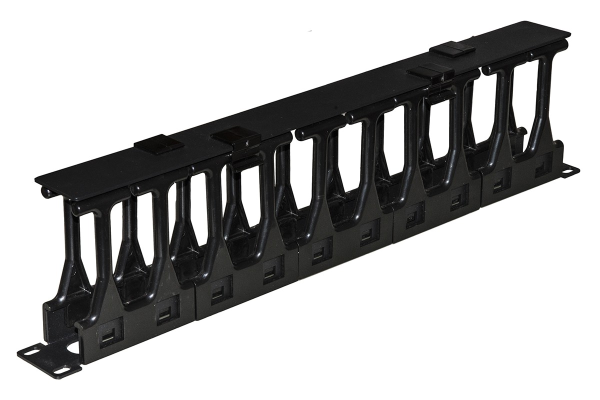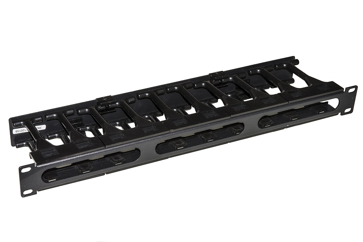 PANNELLO GESTIONE CAVI 1 UNITA' PER ARMADI RACK 19" COLORE NERO Pannello con anelli passacavi per installazione orizzontale su armadi rack 19". Per l'organizzazione e la gestione dei cavi dentro gli armadi rack. La sua altezza maggiore rispetto ai normali pannelli lo rende adatto in installazioni dove siano presenti grandi quantità di cavi. Il coperchio con le doppie cerniere si può aprire da entrambi i lati, sopra/sotto e sotto/sopra, e si può eventualmente rimuovere. Le viti per l'installazione sono incluse. Base in acciaio e 9 fori passaggio cavi tramite ganci in plastica. La base ha 3 fori per permettere il passaggio dei cavi. Questo pannello riunisce grande flessibilità nell'uso, capacità di gestire grandi quantità di cavi e copre la maggior parte delle esigenze di organizzazione cavi in armadi anche molto grandi con frequenti esigenze di interventi.