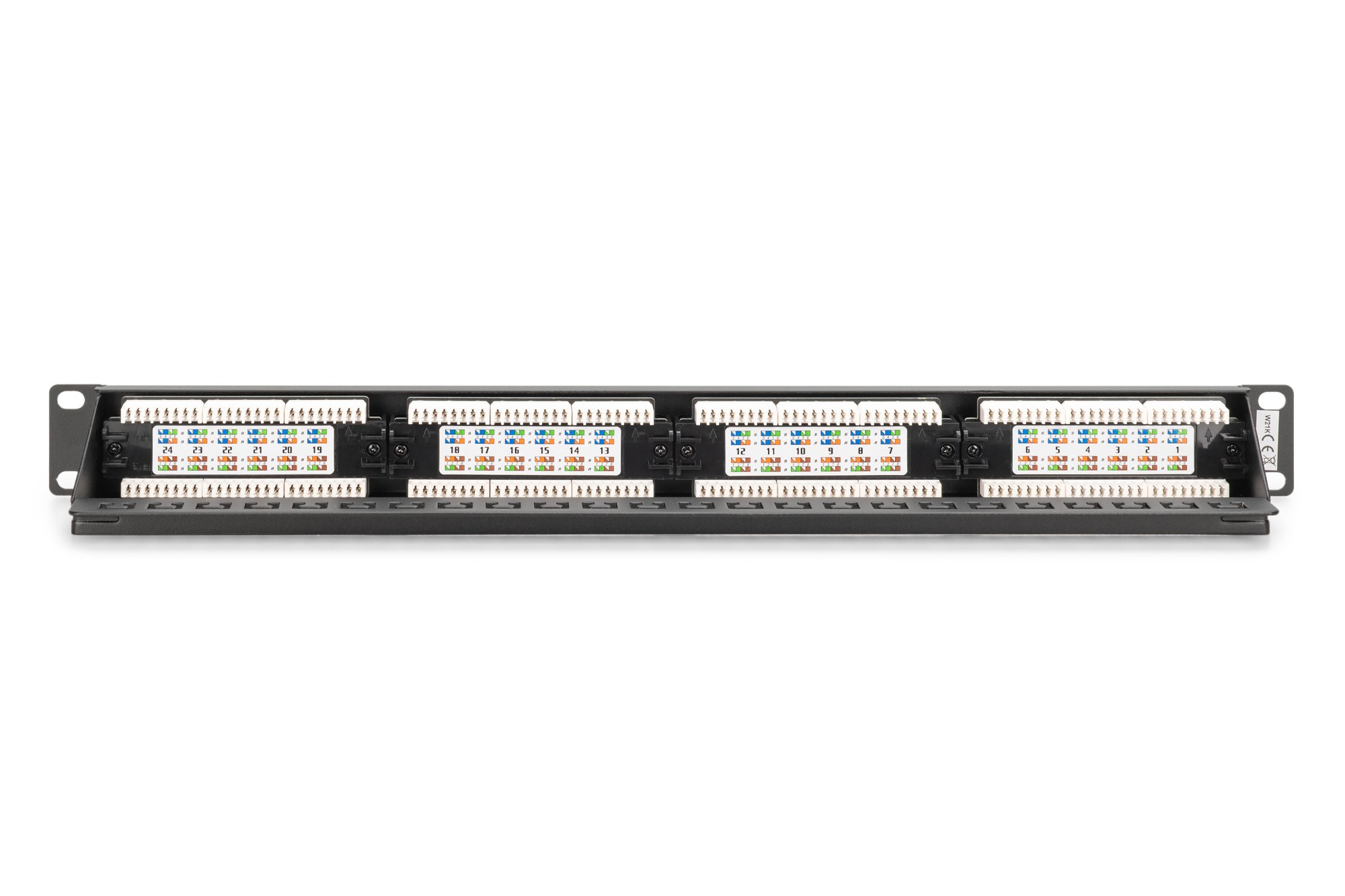 Il patch panel CAT 6 non schermato di DIGITUS® è disponibile nella variante a 16 o 24 porte (1 unità rack) o a 48 porte (2 unità rack). È realizzato in conformità ai requisiti della Link Performance Class E, fino a 250 MHz, ISO/IEC 11801 e EN 50173 ed è certificato UL. L'alloggiamento è realizzato in acciaio zincato da 1,5 mm laminato a freddo ed è quindi perfettamente adatto al montaggio in rack da 19".