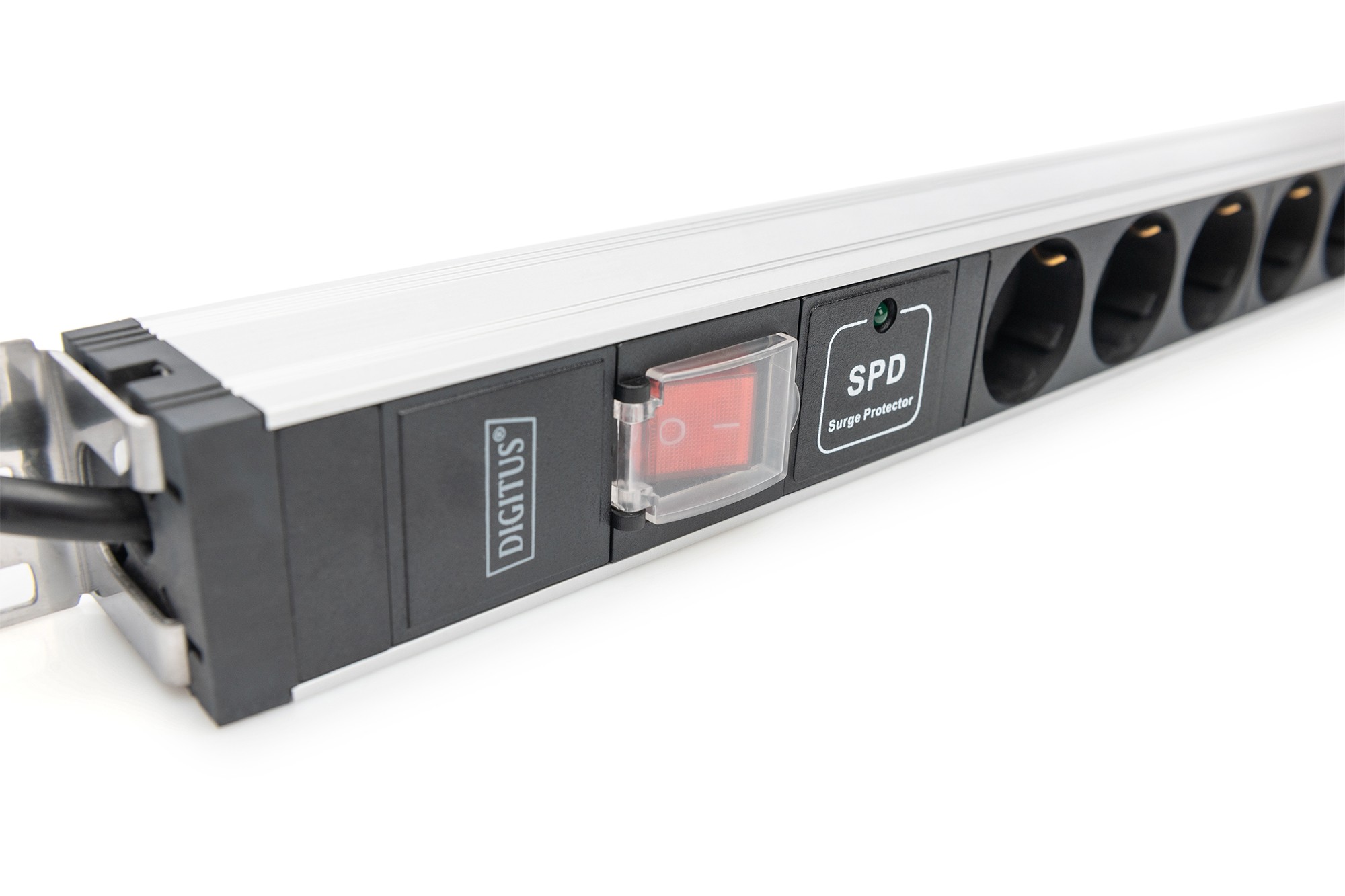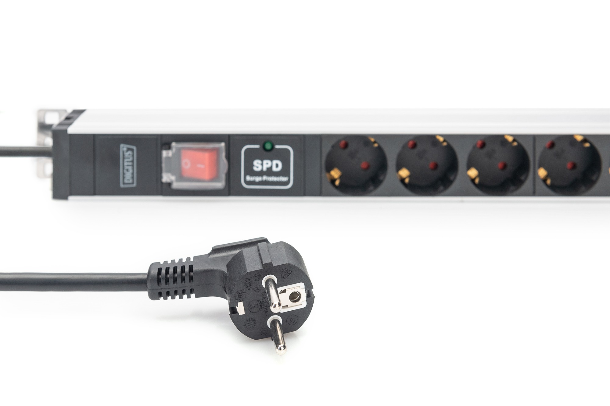 Digitus Presa multipla con profilo in alluminio con interruttore e protezione contro la sovratensione, presa munita di messa a terra 12x, cavo di alim, 1U, Monofase, Verticale, Alluminio, Plastica, 12 presa(e) AC, Tipo F