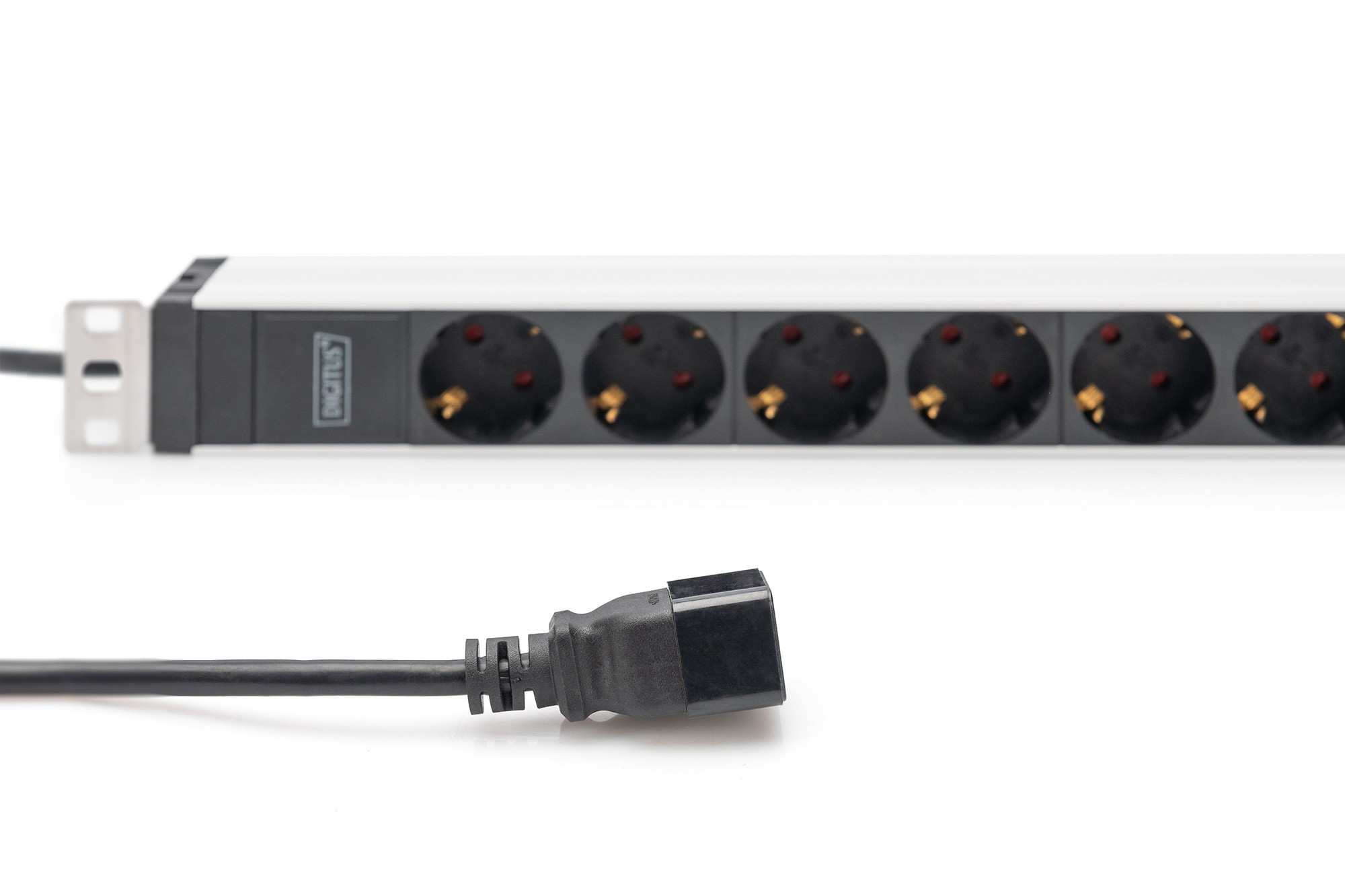 Digitus Presa multipla con profilo in alluminio, 8 prese munite di messa a terra, cavo di alimentazione di 2 m, spina IEC C20, 1U, Monofase, Orizzontale, Alluminio, Plastica, 8 presa(e) AC, Accoppiatore C20