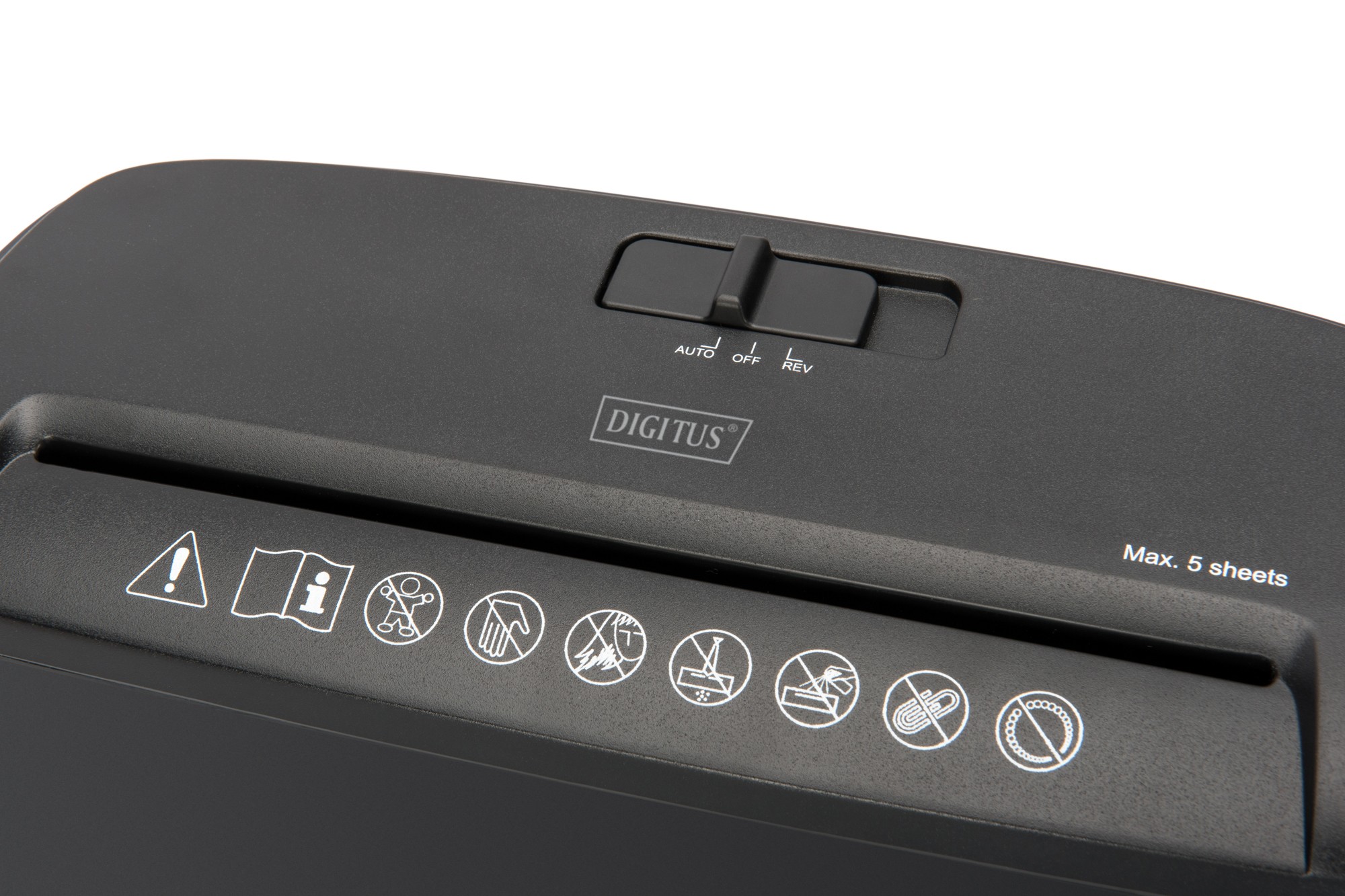 Digitus Tritadocumenti S5. Tipo di sminuzzamento: Taglio a striscia, Ampiezza di funzionamento: 21,8 cm, Dimensione di sminuzzamento: 7 mm. Larghezza: 275 mm, Profondità: 141 mm, Altezza: 321 mm