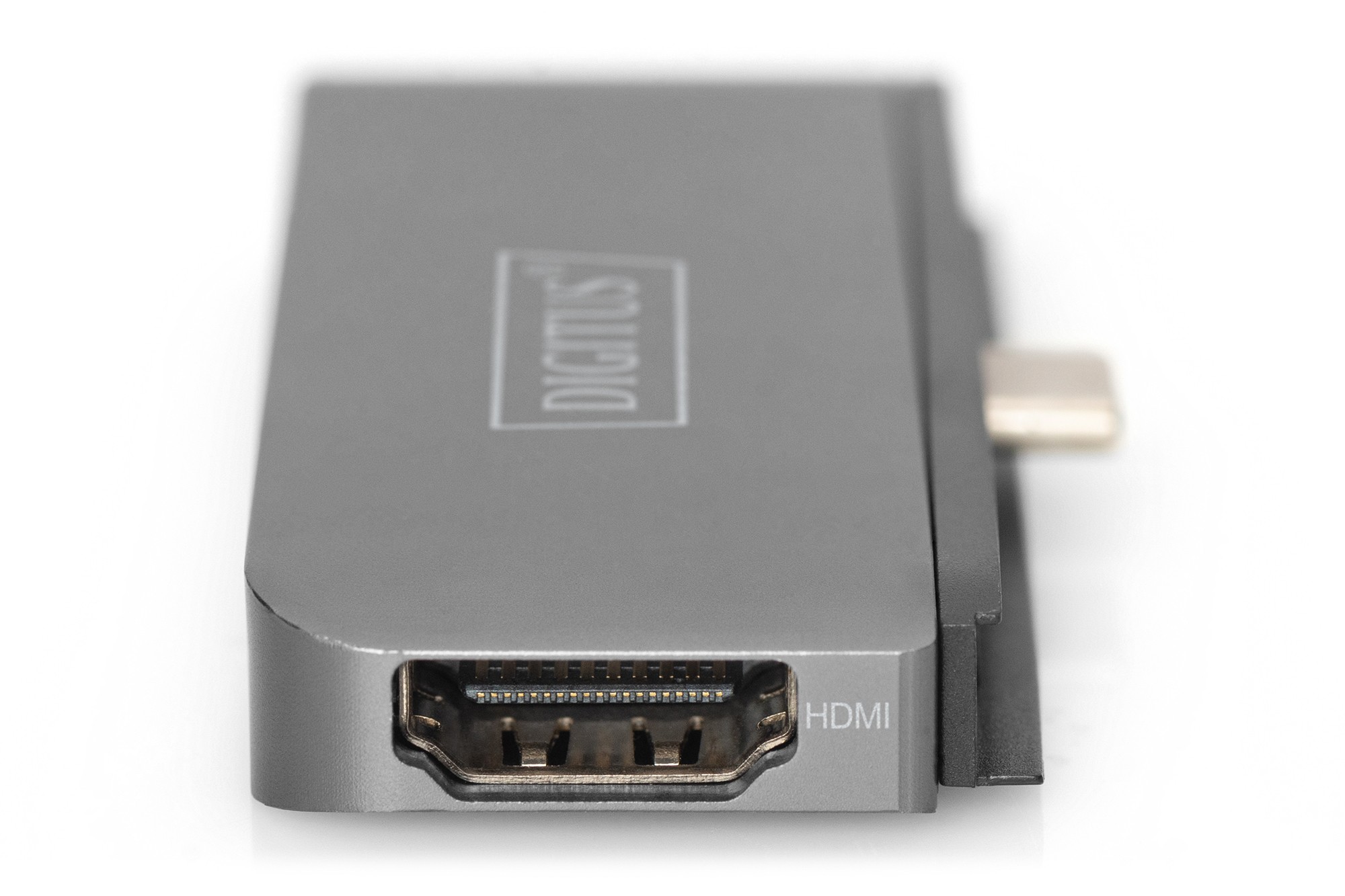 La docking station mobile di DIGITUS® estende ad es. il vostro iPad Pro 2018, MacBook, Surface Go e tutti i dispositivi USB-C™ (che supportano DP Alt-Mode) con 4 ulteriori interfacce. Godetevi il contenuto del vostro tablet su grande apparecchio TV, monitor o videoproiettore. Riproducete il contenuto o estendete* il vostro desktop con l’interfaccia 4K HDMI® del dock. Tramite la presa aggiuntiva USB-C™ durante l’uso и possibile caricare il tablet fino a 100 W (20 V / 5 A), tutto questo grazie alla Power Delivery 3.0. Inoltre и integrata un’interfaccia USB 3.0 con velocitа di trasferimento dati fino a 5 Gbps, a cui potete collegare altri dispositivi periferici come ad es. dischi fissi esterni, chiavette USB e altri dispositivi USB compatibili con versioni precedenti. И anche disponibile un collegamento audio stereo nella docking station per collegare cuffie o un headset. La docking station mobile puт essere connessa senza ingombro direttamente allo slot USB-C™ del tablet e grazie alle dimensioni compatte si puт comodamente riporre nella tasca della giacca. Estendete le vostre interfacce via Plug & Play con la docking station mobile DIGITUS® ideata appositamente per tablet.