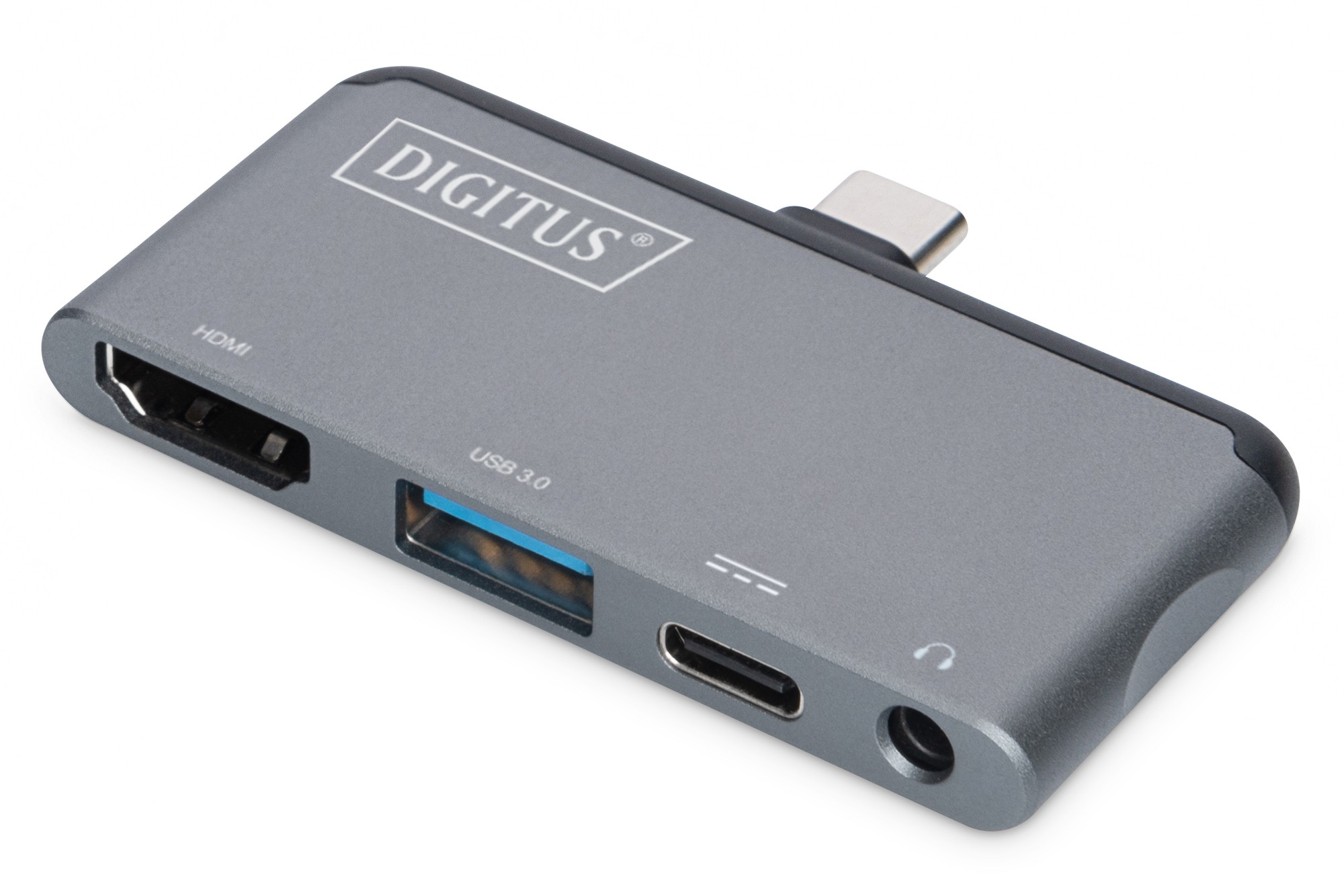 Digitus Docking station mobile USB-C™, 4 porte. Interfaccia host: USB 3.2 Gen 2 (3.1 Gen 2) Type-C, Interfacce hub: USB 3.2 Gen 2 (3.1 Gen 2) Type-C, Massima risoluzione (HDMI): 3840 x 2160 Pixel. Velocità di trasferimento dati: 625 Mbit/s, Colore del prodotto: Grigio, Paese di origine: Cina. Tipo alimentazione: USB. Sistema operativo Windows supportato: Windows 10,Windows 8. Larghezza: 30 mm, Profondità: 63 mm, Altezza: 8 mm
