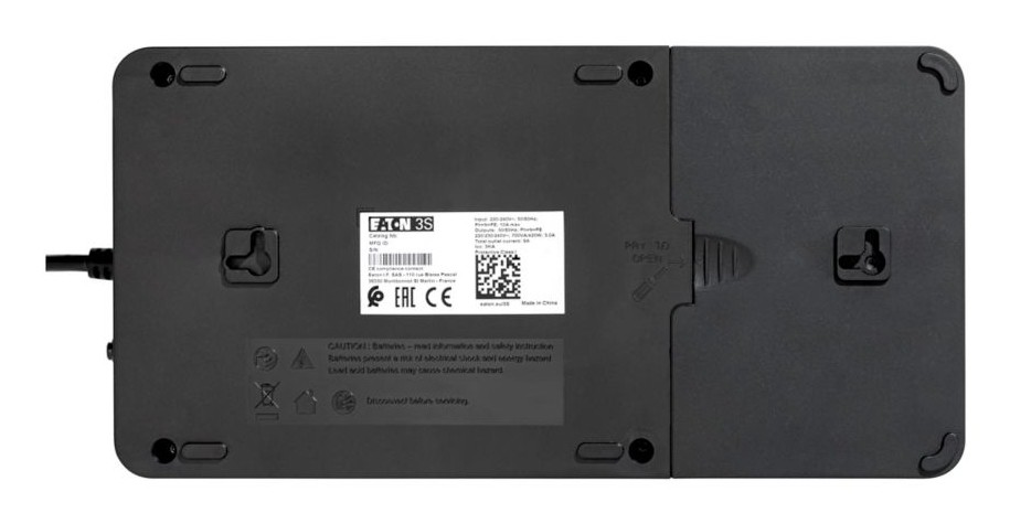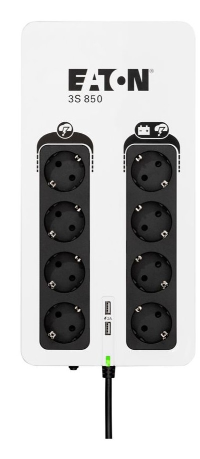 Eaton 3S850D. Topologia UPS: Standby (Offline), Potenza in uscita: 0,85 kVA, Potenza in uscita: 510 W. Tipo di uscita AC: Tipo F, Quantità prese AC: 8 presa(e) AC. Tecnologia batteria: Acido piombo (VRLA). Colore del prodotto: Nero, Bianco, Lunghezza cavo: 1,5 m. Certificazione: CE/EAC/Ukr/Cm/CB report