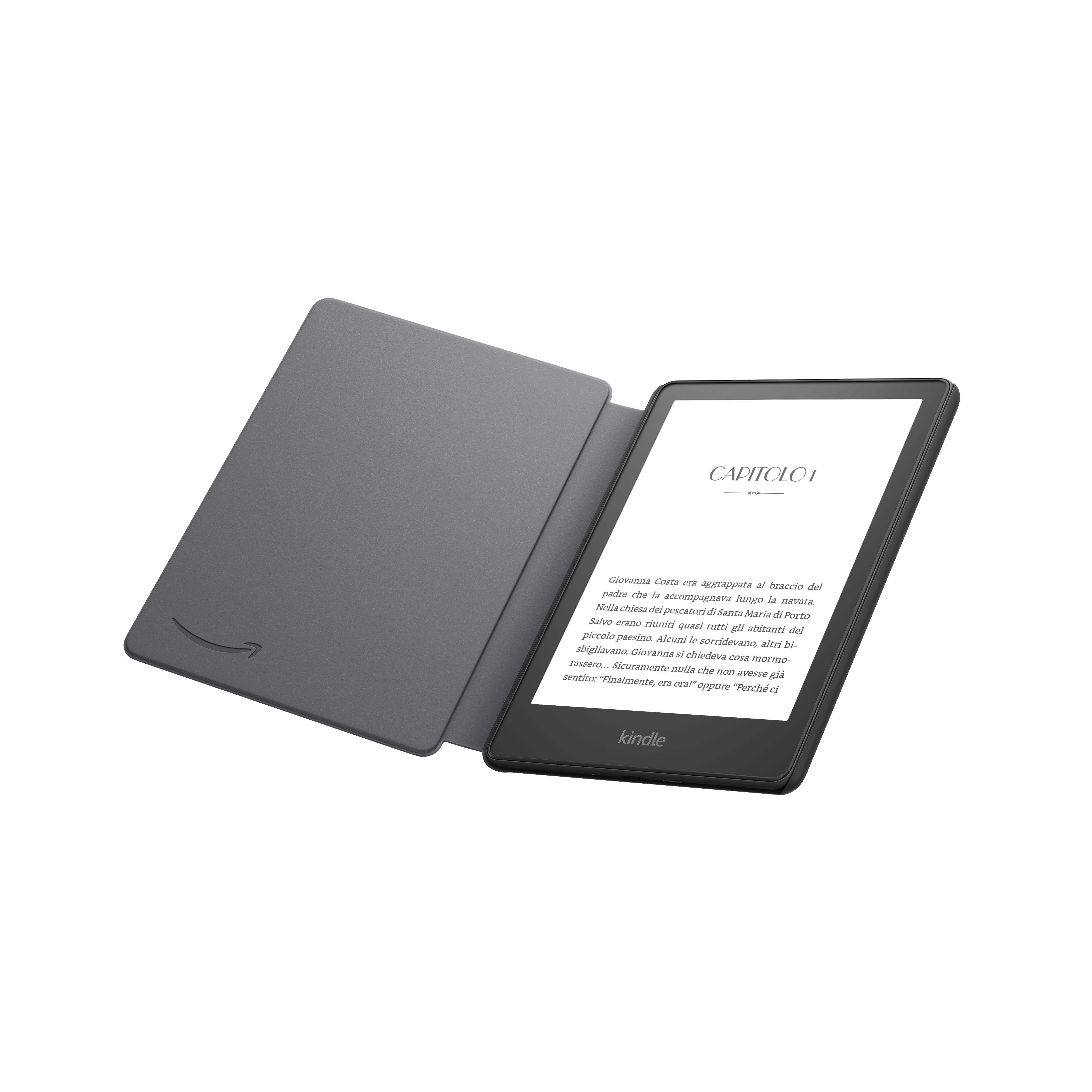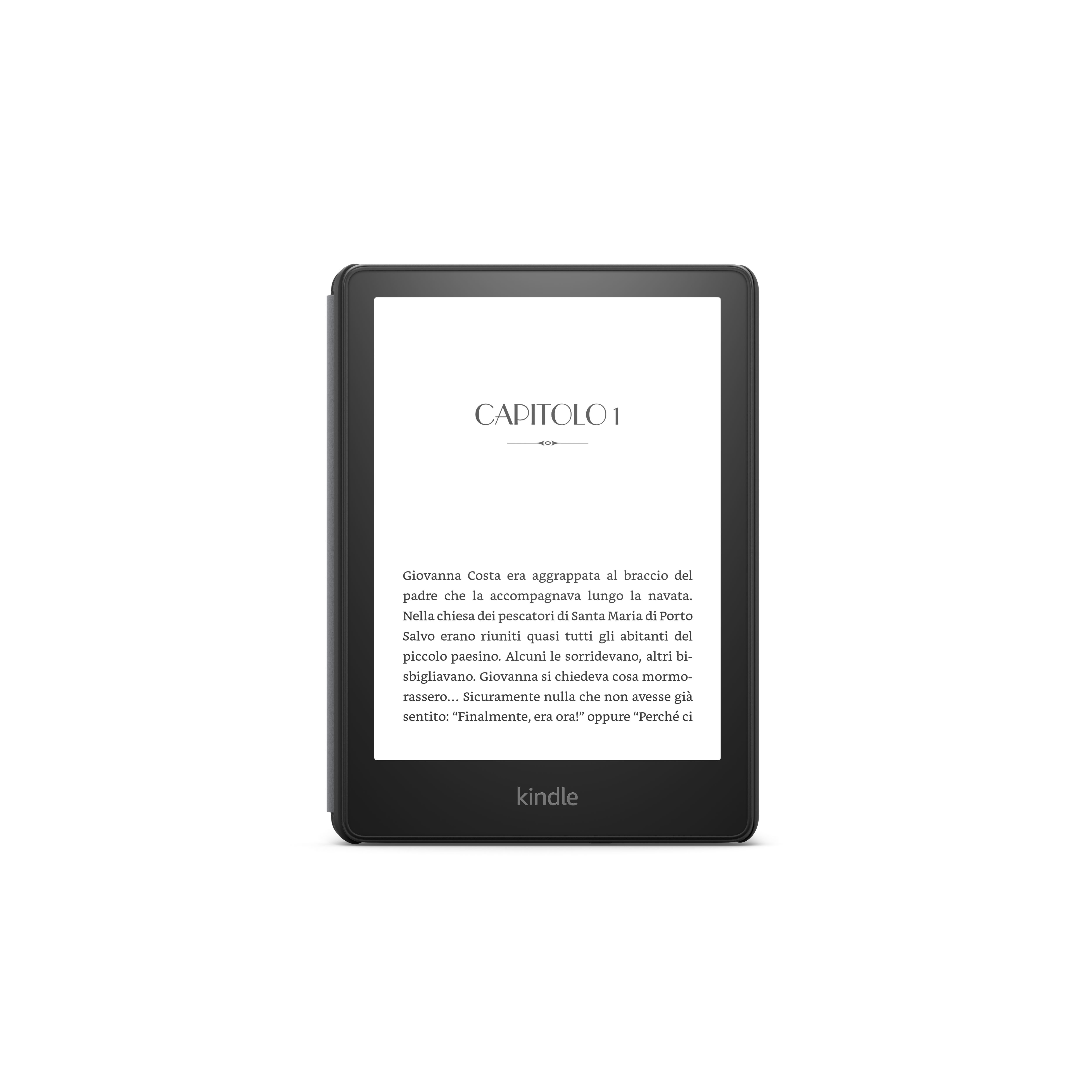 Lasciati conquistare da un libro, ovunque e in qualsiasi momento Kindle Paperwhite è sottile, leggero e facile da trasportare, così puoi goderti i tuoi libri preferiti in qualsiasi momento. Con il nostro caratteristico schermo antiriflesso da 300 ppi di Paperwhite, ora più luminoso del 10% alla massima luminosità rispetto alla generazione precedente, puoi leggere in qualsiasi condizione di luce. Inoltre, una singola carica della batteria tramite USB-C dura fino a 10 settimane. La durata della batteria può variare a seconda dell'uso. Immergiti nella lettura Con il Kindle Paperwhite resistente all’acqua potrai leggere e rilassarti in molti più luoghi, ad esempio in spiaggia o nella vasca da bagno. Kindle Paperwhite è stato testato in laboratorio: ha un livello di protezione IPX8 e può resistere a un’immersione accidentale in acqua dolce fino a 60 minuti a una profondità di 2 metri e in acqua salata fino a 3 minuti a una profondità di 0,25 metri. Maggiori informazioni sulla resistenza all’acqua. Molto più di un libro Da oggi puoi regolare la tonalità del colore dello schermo del tuo Kindle Paperwhite da bianco ad ambra o programmare il passaggio da una tonalità all’altra per un’esperienza di lettura personalizzata. Puoi anche modificare la dimensione dei caratteri e l’intensità del grassetto, a seconda delle tue preferenze. Ampia scelta Trovare nuove storie su Kindle non è mai stato più semplice. Goditi l’accesso a titoli in esclusiva per Kindle che non troverai da nessun’altra parte. Gli iscritti ad Amazon Prime hanno inoltre accesso illimitato a un’ampia selezione di libri, ebook, riviste e molto altro con Prime Reading. Iscriviti a Kindle Unlimited per avere accesso illimitato a oltre un milione di libri. Un tocco personale Progettate da Amazon per adattarsi perfettamente al tuo Kindle Paperwhite, queste custodie sottili e su misura si agganciano saldamente al dispositivo e sono dotate di un’aletta che si piega all’indietro per tenere il dispositivo con una mano sola. L’aletta mette automaticamente il dispositivo in standby quando la chiudi e lo attiva quando la apri, permettendoti di riprendere rapidamente la lettura. Maggiori informazioni sulle custodie Ogni giorno è la Giornata della Terra Non serve essere esperti ambientali per fare scelte sostenibili. Progettando questo lettore di eBook Kindle, abbiamo tenuto in considerazione la sostenibilità. Ecco come: Materiali Il 60% della plastica impiegata nella fabbricazione del dispositivo è riciclata post-consumo. Imballaggio del dispositivo Il 95% dell'imballaggio del dispositivo è a base di fibra di legno proveniente da foreste gestite in modo sostenibile o da fonti riciclabili. Energia pulita Amazon sta costruendo nuovi parchi eolici e centrali fotovoltaiche per produrre una quantità di energia pulita pari all'elettricità usata da questo dispositivo. Dagli una seconda opportunità Può essere che, a un certo punto, tu voglia sostituire o riciclare il tuo dispositivo: scopri le opzioni disponibili con Amazon Second Chance.