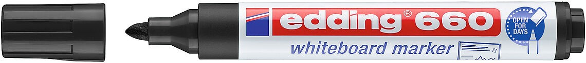 Dopo un incontro intenso o lasciando di fretta un messaggio a casa, può succedere che ci si dimentichi di coprire nuovamente il pennarello. Con il pennarello per lavagna bianca edding 660 non c'è motivo di preoccuparsi. Può essere lasciato scoperto per diversi giorni senza seccarsi, quindi chiunque può utilizzarlo immediatamente. E quel che è ancora meglio, la scrittura può essere facilmente cancellata da qualsiasi lavagna senza lasciare traccia.
