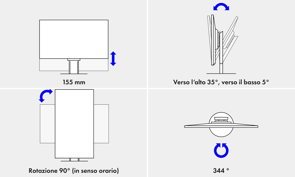 I monitor EIZO possono essere regolati in altezza, inclinati, orientati a destra e a sinistra e, a seconda del modello, abbassati fino alla base del supporto. Ciò consente un'ergonomia ottimale, sia per chi lavora in piedi o per chi sta seduto davanti allo schermo.