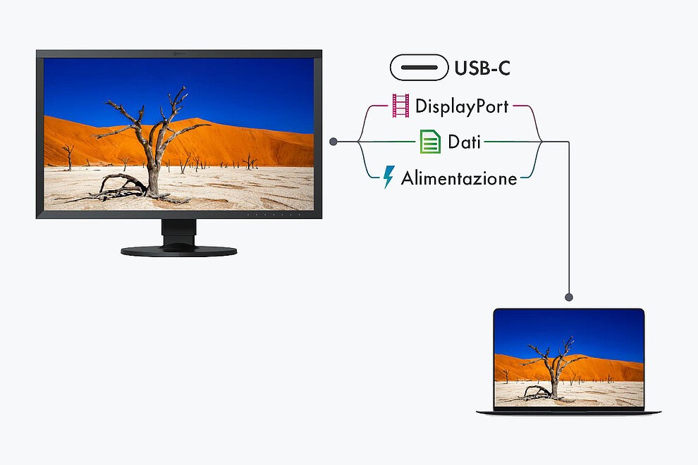 Con un unico cavo USB-C è possibile visualizzare immagini, trasmettere dati e ricaricare i dispositivi connessi. In maniera poco ingombrante e pratica, il monitor ColorEdge CS2400R si trasforma in una docking station e potenzia la connettività. Periferiche come mouse, tastiera o stampante sono collegate direttamente alle porte USB-A. Portatili e tablet possono essere, inoltre, ricaricati mediante il cavo USB-C fino ad una potenza di 70 W.
